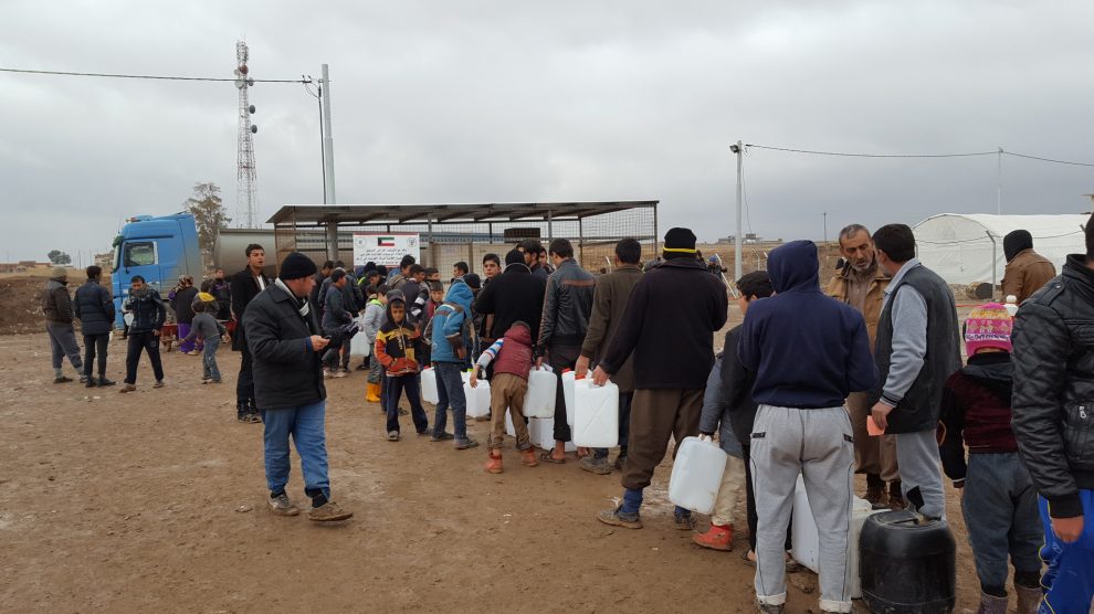 وزعت دولة الكويت اليوم الاثنين 30 الف لتر من النفط الابيض على النازحين العراقيين في مخيم الخازر شرقي الموصل.