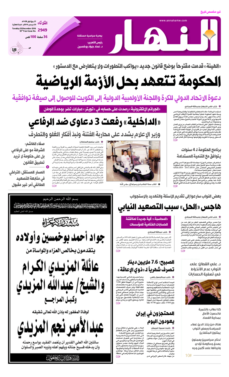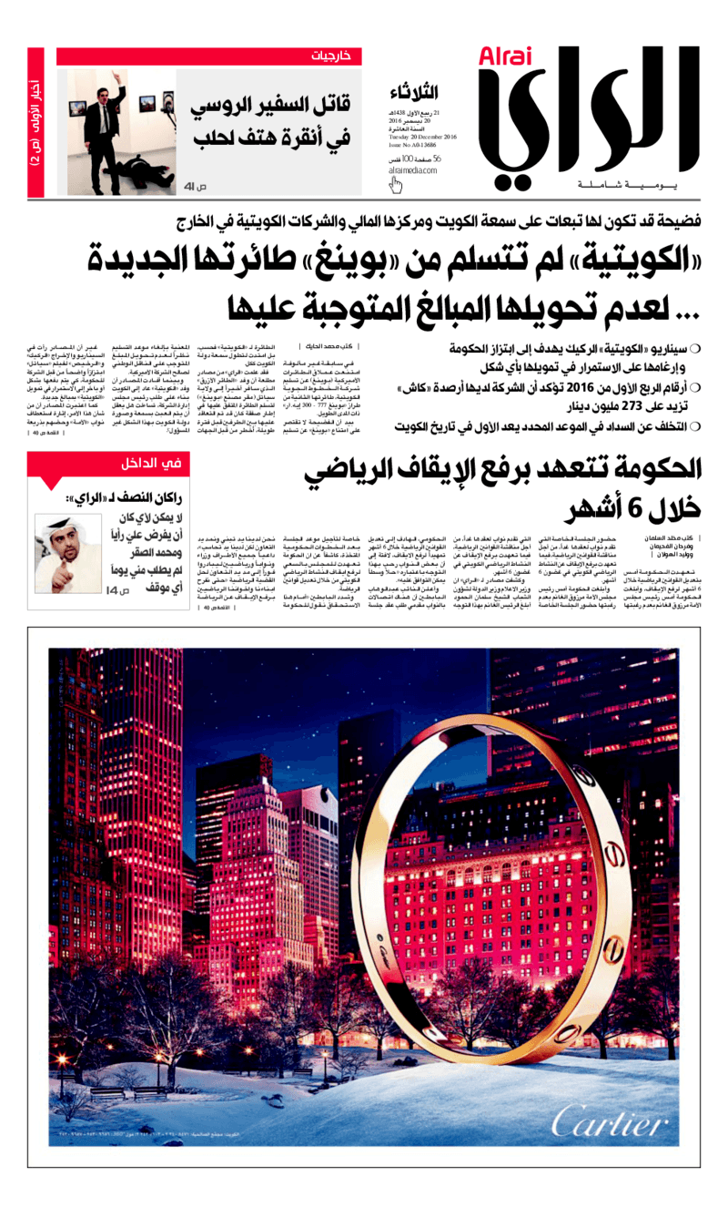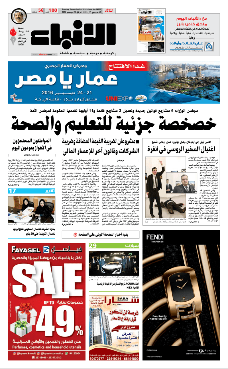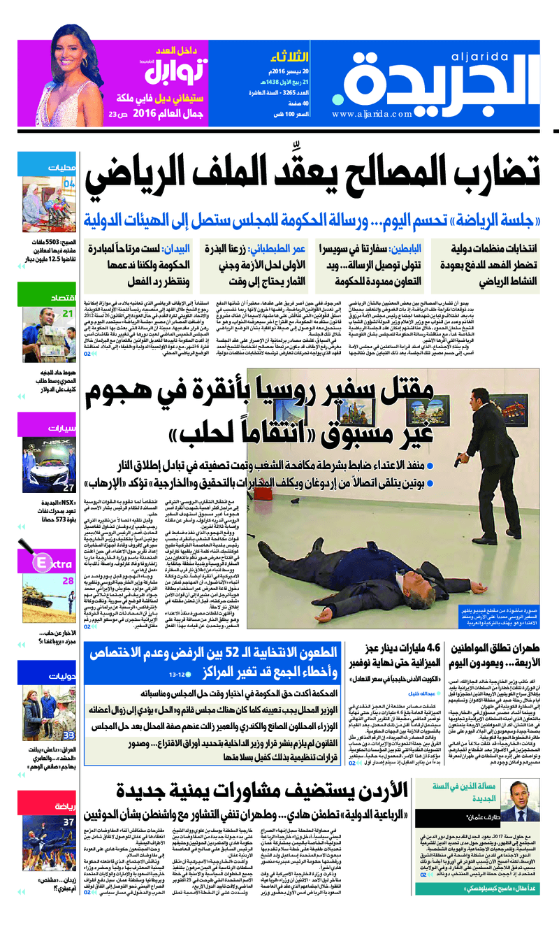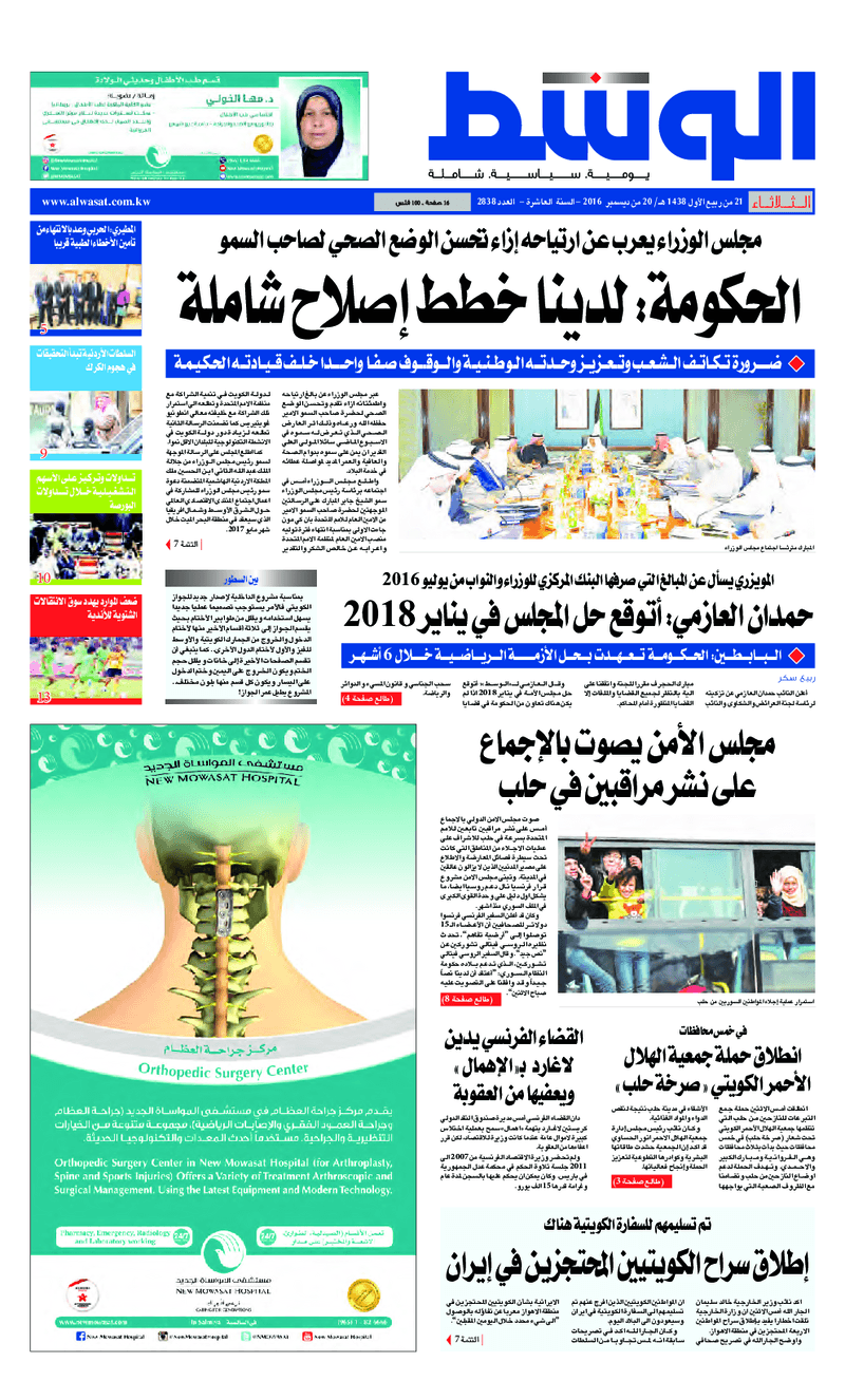 آخر الأخبار جرائم وقضايا “الجمارك” تضبط 29 ألف علبة مشروبات كحولية قادمة من دولة آسيوية في ميناء الشويخ 9 يونيو، 2024 محليات ممثلة عن دولة الكويت الطبيبة الكويتية أسماء الكندري تشارك في المؤتمر العالمي للمناظير في إيطاليا 8 يونيو، 2024 محليات “الصحة”: اكتمال وصول فريق الخدمات الطبية ببعثة الحج الكويتية لمكة المكرمة 8 يونيو، 2024 محليات “الصحة” تحدد 8 مراكز للصحة المدرسية لاستقبال الطلبة المبتعثين 8 يونيو، 2024 عربي وعالمي “الصحة العالمية”: تسجيل أول وفاة لشخص مصاب بـ«أنفلونزا الطيور» 7 يونيو، 2024 محليات عناوين الصحف الكويتية ليوم الثلاثاء 20 ديسمبر 2016 محرر المحليات20 ديسمبر، 2016أضف تعليق1 دقائق جريدة الجريدة جريدة الأنباء جريدة القبس جريدة السياسة جريدة الراي جريدة الوسط جريدة النهار الوسومTop عناوين الصحف المحلية من الممكن أن يعجبك جرائم وقضايا “الجمارك” تضبط 29 ألف علبة مشروبات كحولية قادمة من دولة آسيوية في ميناء الشويخ محليات ممثلة عن دولة الكويت الطبيبة الكويتية أسماء الكندري تشارك في المؤتمر العالمي للمناظير في إيطاليا محليات “الصحة”: اكتمال وصول فريق الخدمات الطبية ببعثة الحج الكويتية لمكة المكرمة محليات “الصحة” تحدد 8 مراكز للصحة المدرسية لاستقبال الطلبة المبتعثين عربي وعالمي “الصحة العالمية”: تسجيل أول وفاة لشخص مصاب بـ«أنفلونزا الطيور» تكنولوجيا رش السحب بملح البحر.. تجربة “ثورية” لتبريد كوكب الأرض أضف تعليق أضغط هنا لإضافة تعليق إلغاء الردالتعليقالاسم البريد الإلكتروني الموقع الإلكتروني Δ هذا الموقع يستخدم خدمة أكيسميت للتقليل من البريد المزعجة. اعرف المزيد عن كيفية التعامل مع بيانات التعليقات الخاصة بك processed.