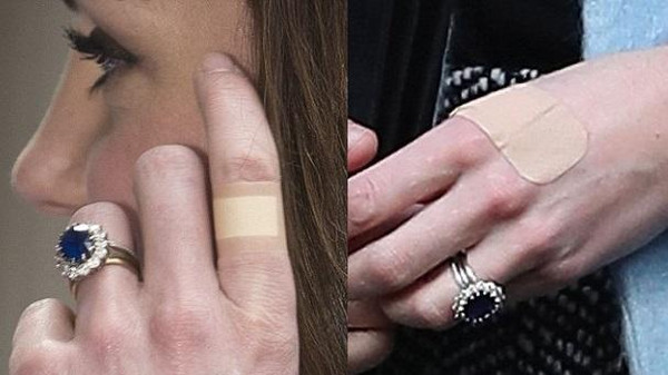 صورة 2008 تم التقاطها حين خرجت من ناد ليلي خاص، اسمه Bouji في لندن، ولم تكن وقتها متزوجة من الأمير وليام، إنما على صداقة حميمية معه. أما صورتا نوفمبر هذا العام، ففي إحداهما لصقة كبيرة على اليد اليسرى، وأصغر بإبهام اليد نفسها، ولكن في تاريخ مختلف من الشهر نفسه. في حين أن لصقة 2008 هي في إصبع السبابة، ولصقة يناير 2015 بالإصبع الوسطى. أما بالصورة الأحدث، أي عيد الميلاد الأحد الماضي، فنرى اللصقة بإبهام اليد اليسرى.