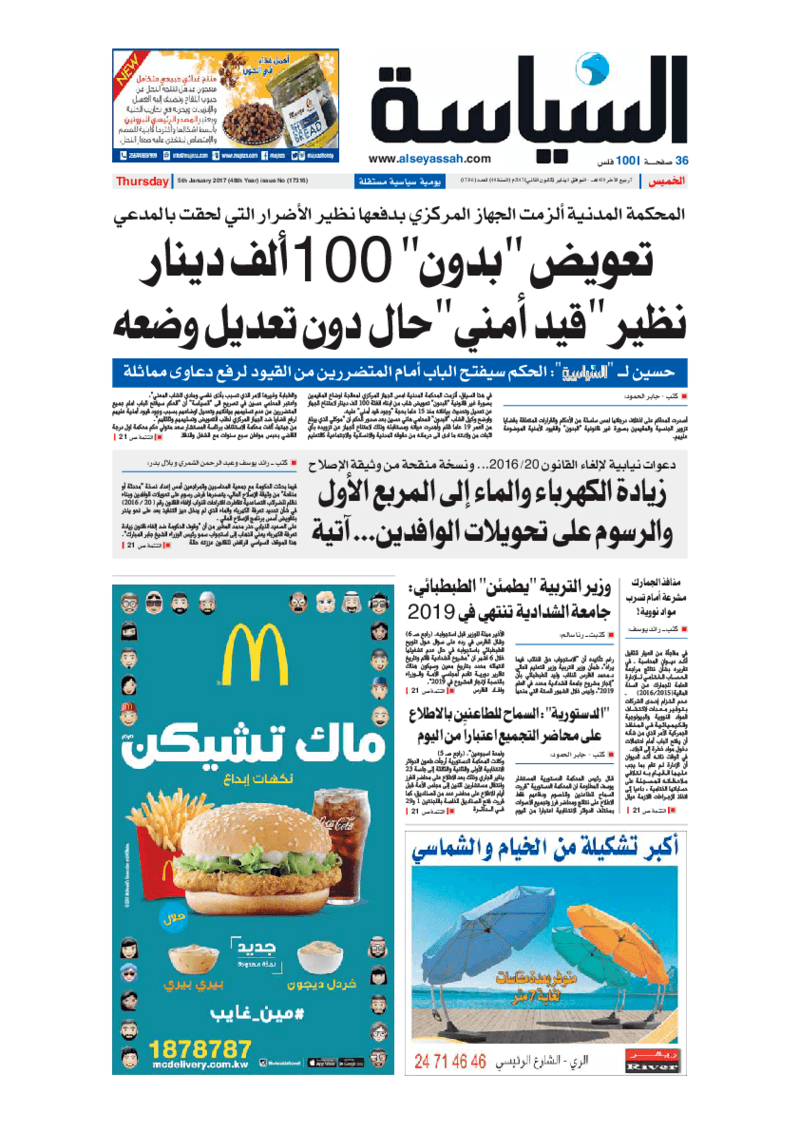 آخر الأخبار جرائم وقضايا “الجمارك” تضبط 29 ألف علبة مشروبات كحولية قادمة من دولة آسيوية في ميناء الشويخ 9 يونيو، 2024 محليات ممثلة عن دولة الكويت الطبيبة الكويتية أسماء الكندري تشارك في المؤتمر العالمي للمناظير في إيطاليا 8 يونيو، 2024 محليات “الصحة”: اكتمال وصول فريق الخدمات الطبية ببعثة الحج الكويتية لمكة المكرمة 8 يونيو، 2024 محليات “الصحة” تحدد 8 مراكز للصحة المدرسية لاستقبال الطلبة المبتعثين 8 يونيو، 2024 عربي وعالمي “الصحة العالمية”: تسجيل أول وفاة لشخص مصاب بـ«أنفلونزا الطيور» 7 يونيو، 2024 محليات عناوين الصحف الكويتية ليوم الخميس 05 يناير 2017 محرر المحليات5 يناير، 2017أضف تعليق1 دقائق جريدة الجريدة جريدة الأنباء جريدة القبس جريدة السياسة جريدة الوطن جريدة الراي جريدة الوسط جريدة النهار الوسومTop عناوين الصحف المحلية من الممكن أن يعجبك جرائم وقضايا “الجمارك” تضبط 29 ألف علبة مشروبات كحولية قادمة من دولة آسيوية في ميناء الشويخ محليات ممثلة عن دولة الكويت الطبيبة الكويتية أسماء الكندري تشارك في المؤتمر العالمي للمناظير في إيطاليا محليات “الصحة”: اكتمال وصول فريق الخدمات الطبية ببعثة الحج الكويتية لمكة المكرمة محليات “الصحة” تحدد 8 مراكز للصحة المدرسية لاستقبال الطلبة المبتعثين عربي وعالمي “الصحة العالمية”: تسجيل أول وفاة لشخص مصاب بـ«أنفلونزا الطيور» تكنولوجيا رش السحب بملح البحر.. تجربة “ثورية” لتبريد كوكب الأرض أضف تعليق أضغط هنا لإضافة تعليق إلغاء الردالتعليقالاسم البريد الإلكتروني الموقع الإلكتروني Δ هذا الموقع يستخدم خدمة أكيسميت للتقليل من البريد المزعجة. اعرف المزيد عن كيفية التعامل مع بيانات التعليقات الخاصة بك processed.