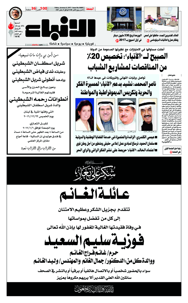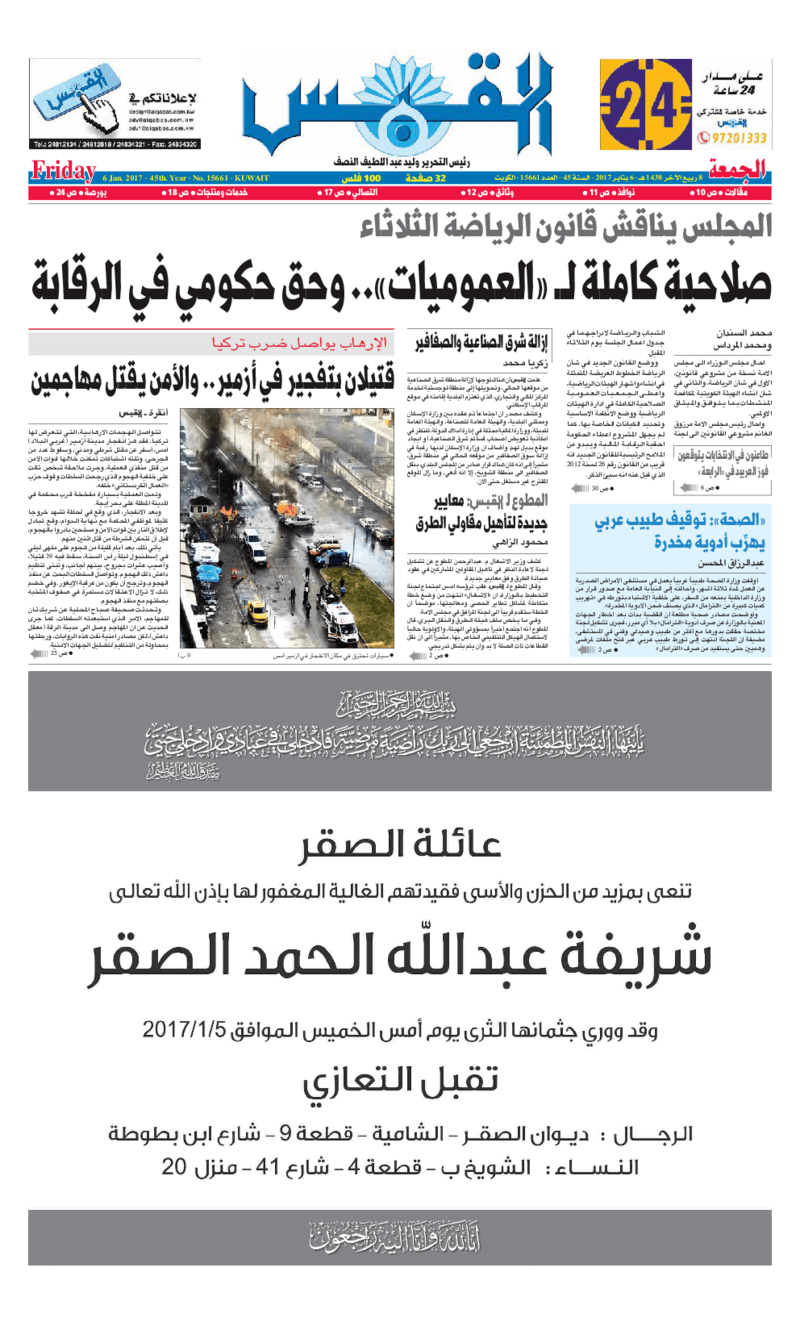 آخر الأخبار جرائم وقضايا “الجمارك” تضبط 29 ألف علبة مشروبات كحولية قادمة من دولة آسيوية في ميناء الشويخ 9 يونيو، 2024 محليات ممثلة عن دولة الكويت الطبيبة الكويتية أسماء الكندري تشارك في المؤتمر العالمي للمناظير في إيطاليا 8 يونيو، 2024 محليات “الصحة”: اكتمال وصول فريق الخدمات الطبية ببعثة الحج الكويتية لمكة المكرمة 8 يونيو، 2024 محليات “الصحة” تحدد 8 مراكز للصحة المدرسية لاستقبال الطلبة المبتعثين 8 يونيو، 2024 عربي وعالمي “الصحة العالمية”: تسجيل أول وفاة لشخص مصاب بـ«أنفلونزا الطيور» 7 يونيو، 2024 محليات عناوين الصحف الكويتية ليوم الجمعة 06 يناير 2017 محرر المحليات6 يناير، 2017أضف تعليق1 دقائق جريدة الجريدة جريدة الأنباء جريدة القبس جريدة السياسة جريدة الراي جريدة النهار الوسومTop عناوين الصحف المحلية من الممكن أن يعجبك جرائم وقضايا “الجمارك” تضبط 29 ألف علبة مشروبات كحولية قادمة من دولة آسيوية في ميناء الشويخ محليات ممثلة عن دولة الكويت الطبيبة الكويتية أسماء الكندري تشارك في المؤتمر العالمي للمناظير في إيطاليا محليات “الصحة”: اكتمال وصول فريق الخدمات الطبية ببعثة الحج الكويتية لمكة المكرمة محليات “الصحة” تحدد 8 مراكز للصحة المدرسية لاستقبال الطلبة المبتعثين عربي وعالمي “الصحة العالمية”: تسجيل أول وفاة لشخص مصاب بـ«أنفلونزا الطيور» تكنولوجيا رش السحب بملح البحر.. تجربة “ثورية” لتبريد كوكب الأرض أضف تعليق أضغط هنا لإضافة تعليق إلغاء الردالتعليقالاسم البريد الإلكتروني الموقع الإلكتروني Δ هذا الموقع يستخدم خدمة أكيسميت للتقليل من البريد المزعجة. اعرف المزيد عن كيفية التعامل مع بيانات التعليقات الخاصة بك processed.