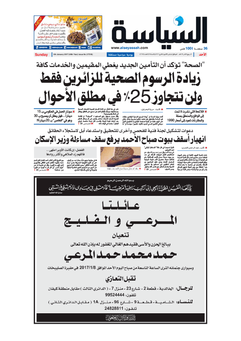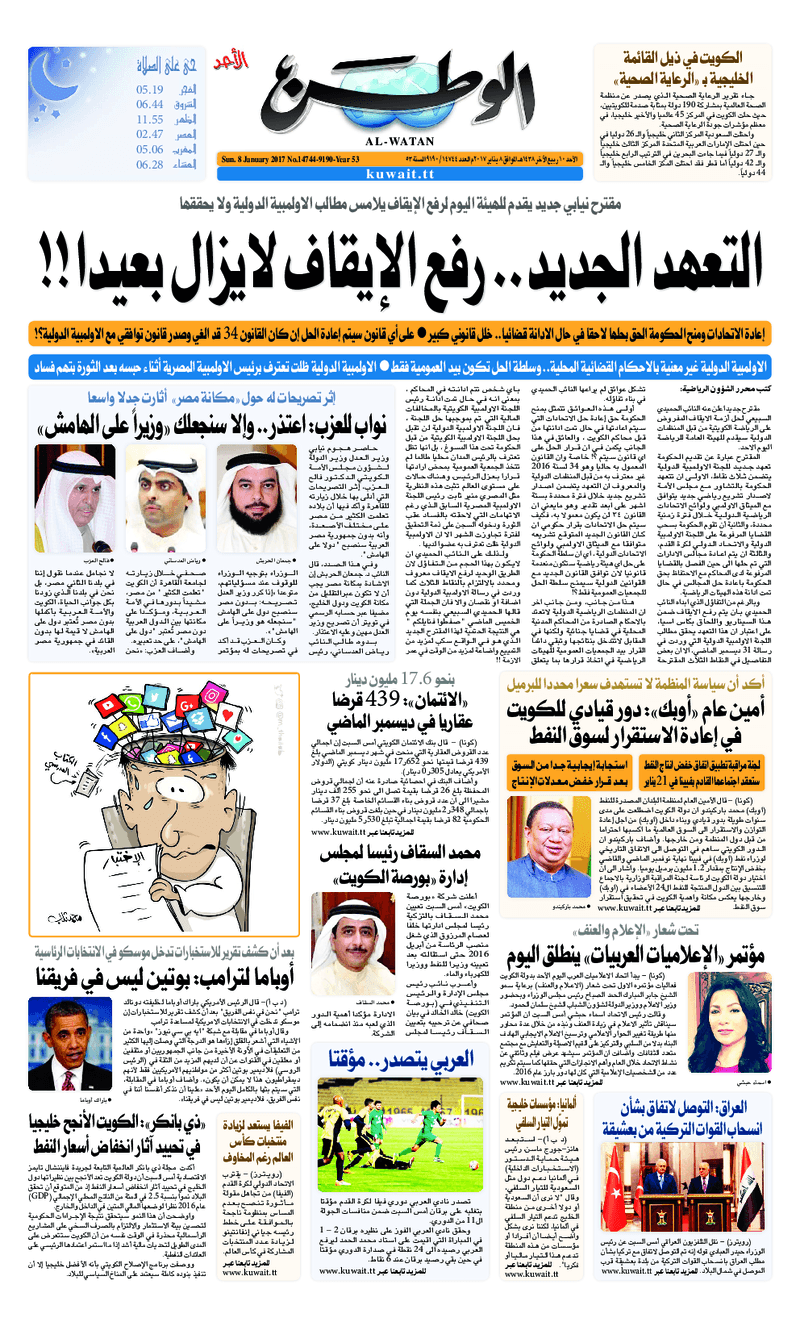 آخر الأخبار جرائم وقضايا “الجمارك” تضبط 29 ألف علبة مشروبات كحولية قادمة من دولة آسيوية في ميناء الشويخ 9 يونيو، 2024 محليات ممثلة عن دولة الكويت الطبيبة الكويتية أسماء الكندري تشارك في المؤتمر العالمي للمناظير في إيطاليا 8 يونيو، 2024 محليات “الصحة”: اكتمال وصول فريق الخدمات الطبية ببعثة الحج الكويتية لمكة المكرمة 8 يونيو، 2024 محليات “الصحة” تحدد 8 مراكز للصحة المدرسية لاستقبال الطلبة المبتعثين 8 يونيو، 2024 عربي وعالمي “الصحة العالمية”: تسجيل أول وفاة لشخص مصاب بـ«أنفلونزا الطيور» 7 يونيو، 2024 محليات عناوين الصحف الكويتية ليوم الأحد 08 يناير 2017 محرر المحليات8 يناير، 2017أضف تعليق1 دقائق جريدة الجريدة جريدة الأنباء جريدة القبس جريدة السياسة جريدة الوطن جريدة الراي جريدة الوسط جريدة النهار الوسومTop عناوين الصحف المحلية من الممكن أن يعجبك جرائم وقضايا “الجمارك” تضبط 29 ألف علبة مشروبات كحولية قادمة من دولة آسيوية في ميناء الشويخ محليات ممثلة عن دولة الكويت الطبيبة الكويتية أسماء الكندري تشارك في المؤتمر العالمي للمناظير في إيطاليا محليات “الصحة”: اكتمال وصول فريق الخدمات الطبية ببعثة الحج الكويتية لمكة المكرمة محليات “الصحة” تحدد 8 مراكز للصحة المدرسية لاستقبال الطلبة المبتعثين عربي وعالمي “الصحة العالمية”: تسجيل أول وفاة لشخص مصاب بـ«أنفلونزا الطيور» تكنولوجيا رش السحب بملح البحر.. تجربة “ثورية” لتبريد كوكب الأرض أضف تعليق أضغط هنا لإضافة تعليق إلغاء الردالتعليقالاسم البريد الإلكتروني الموقع الإلكتروني Δ هذا الموقع يستخدم خدمة أكيسميت للتقليل من البريد المزعجة. اعرف المزيد عن كيفية التعامل مع بيانات التعليقات الخاصة بك processed.