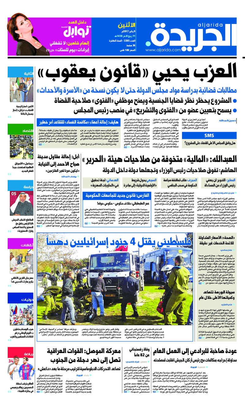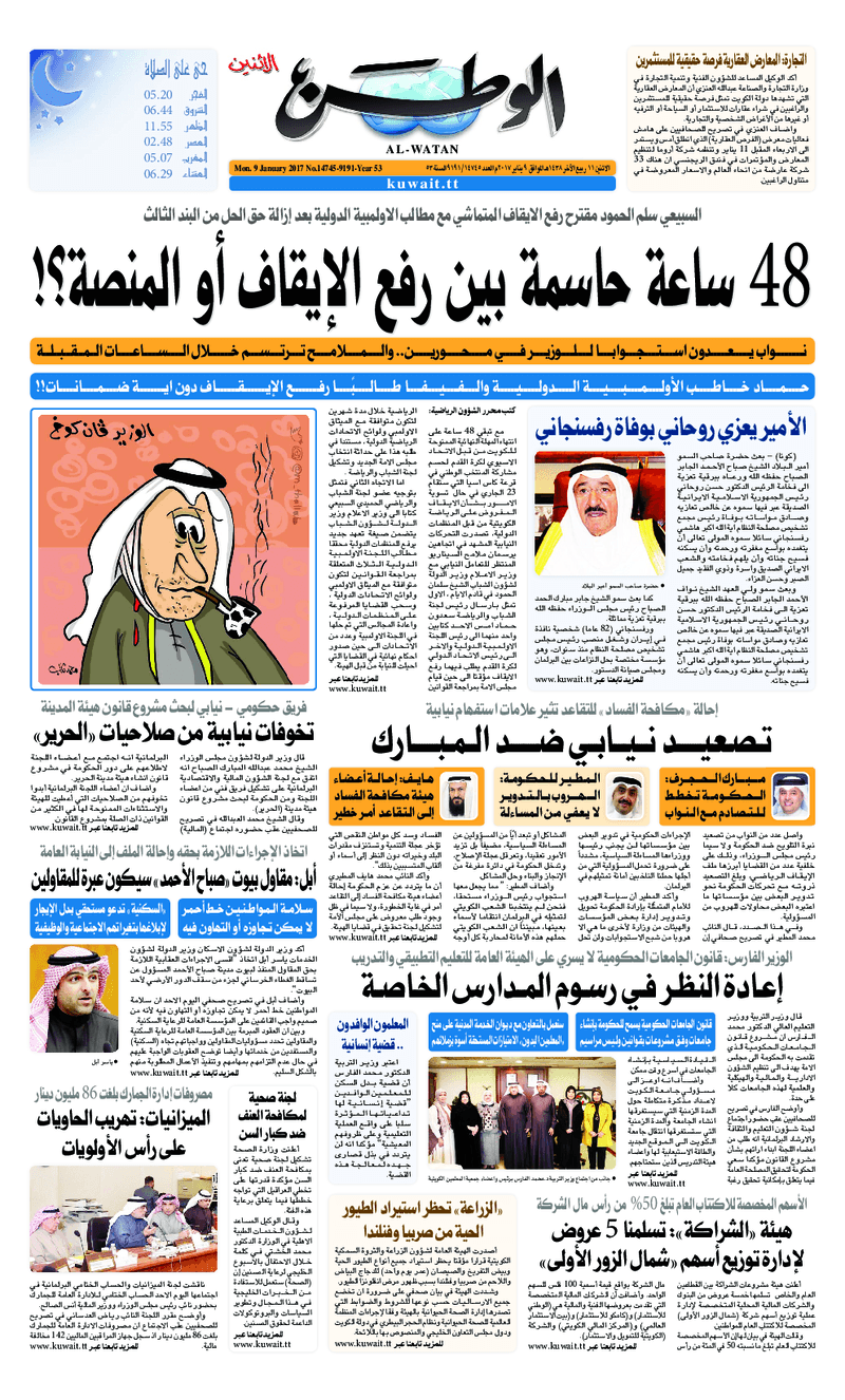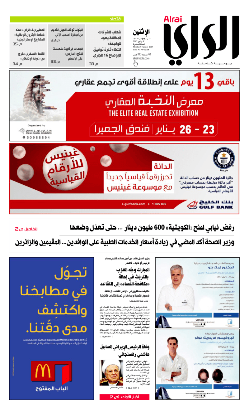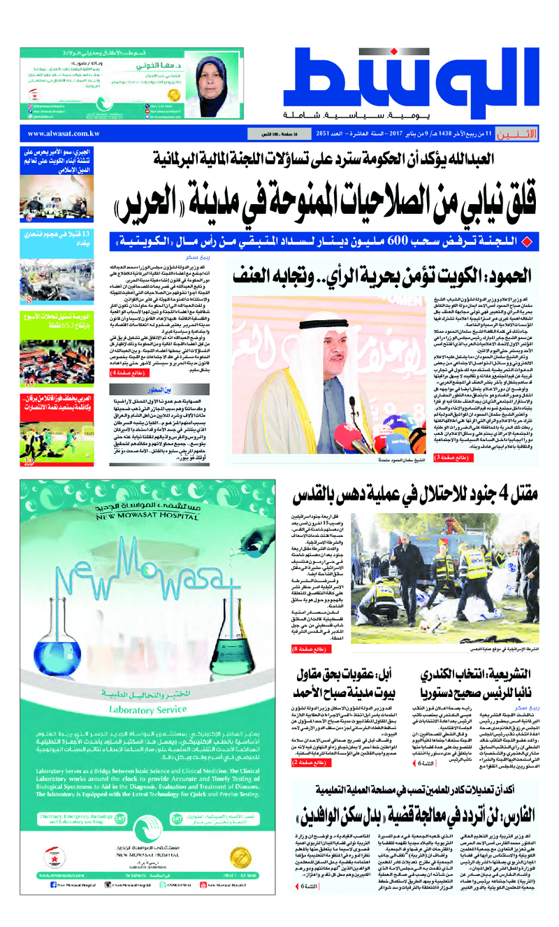 آخر الأخبار جرائم وقضايا “الجمارك” تضبط 29 ألف علبة مشروبات كحولية قادمة من دولة آسيوية في ميناء الشويخ 9 يونيو، 2024 محليات ممثلة عن دولة الكويت الطبيبة الكويتية أسماء الكندري تشارك في المؤتمر العالمي للمناظير في إيطاليا 8 يونيو، 2024 محليات “الصحة”: اكتمال وصول فريق الخدمات الطبية ببعثة الحج الكويتية لمكة المكرمة 8 يونيو، 2024 محليات “الصحة” تحدد 8 مراكز للصحة المدرسية لاستقبال الطلبة المبتعثين 8 يونيو، 2024 عربي وعالمي “الصحة العالمية”: تسجيل أول وفاة لشخص مصاب بـ«أنفلونزا الطيور» 7 يونيو، 2024 محليات عناوين الصحف الكويتية ليوم الاثنين 09 يناير 2017 محرر المحليات9 يناير، 2017أضف تعليق1 دقائق جريدة الجريدة جريدة الأنباء جريدة القبس جريدة السياسة جريدة الوطن جريدة الراي جريدة الوسط جريدة النهار الوسومTop عناوين الصحف المحلية من الممكن أن يعجبك جرائم وقضايا “الجمارك” تضبط 29 ألف علبة مشروبات كحولية قادمة من دولة آسيوية في ميناء الشويخ محليات ممثلة عن دولة الكويت الطبيبة الكويتية أسماء الكندري تشارك في المؤتمر العالمي للمناظير في إيطاليا محليات “الصحة”: اكتمال وصول فريق الخدمات الطبية ببعثة الحج الكويتية لمكة المكرمة محليات “الصحة” تحدد 8 مراكز للصحة المدرسية لاستقبال الطلبة المبتعثين عربي وعالمي “الصحة العالمية”: تسجيل أول وفاة لشخص مصاب بـ«أنفلونزا الطيور» تكنولوجيا رش السحب بملح البحر.. تجربة “ثورية” لتبريد كوكب الأرض أضف تعليق أضغط هنا لإضافة تعليق إلغاء الردالتعليقالاسم البريد الإلكتروني الموقع الإلكتروني Δ هذا الموقع يستخدم خدمة أكيسميت للتقليل من البريد المزعجة. اعرف المزيد عن كيفية التعامل مع بيانات التعليقات الخاصة بك processed.