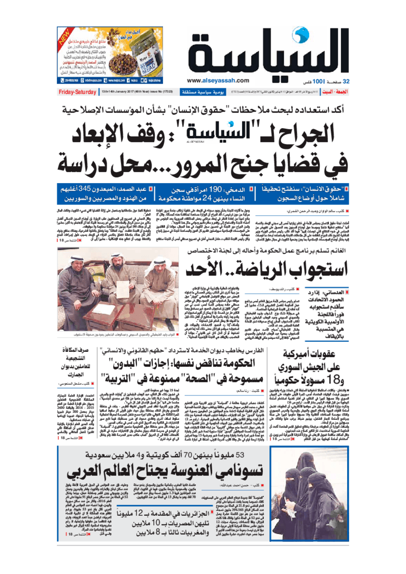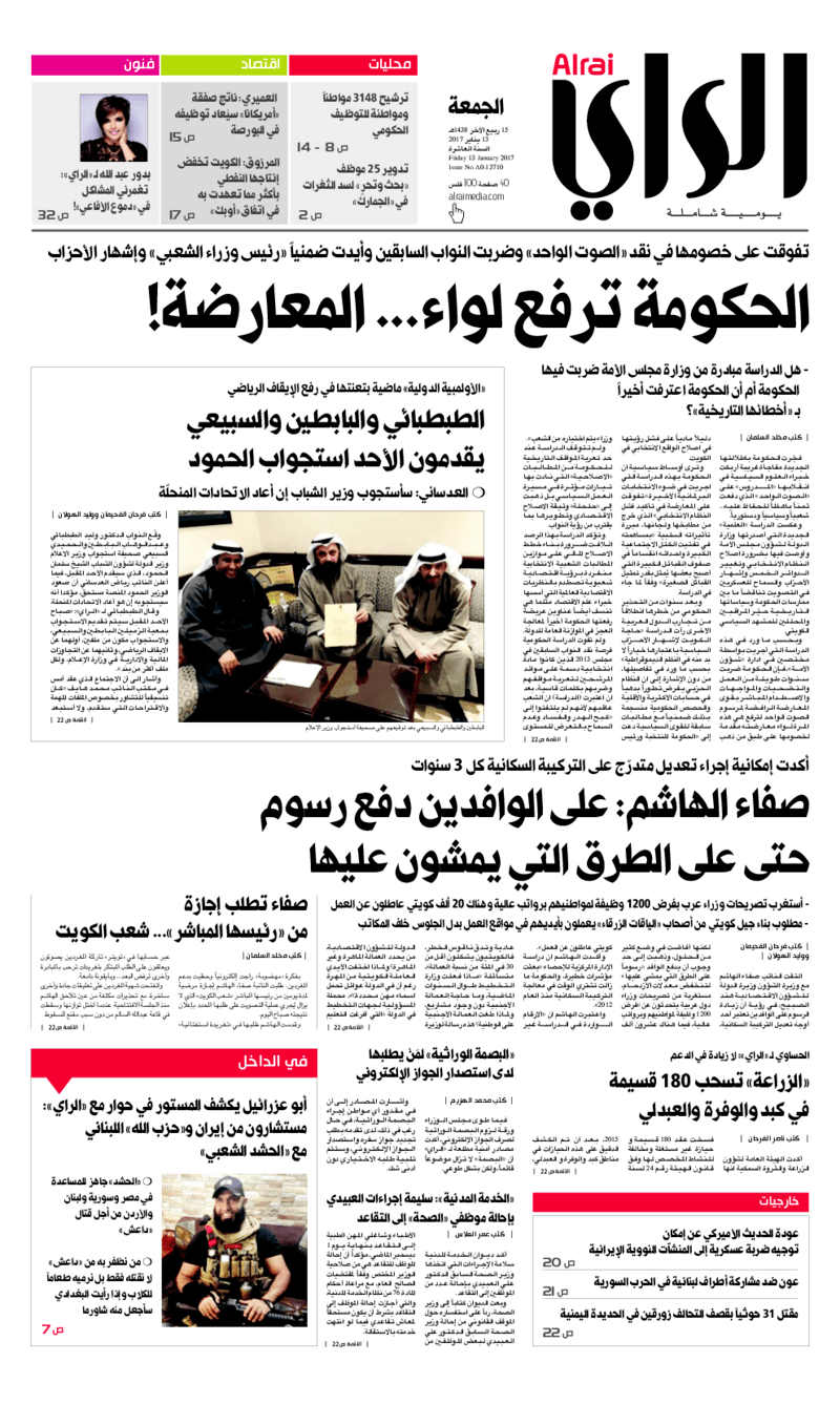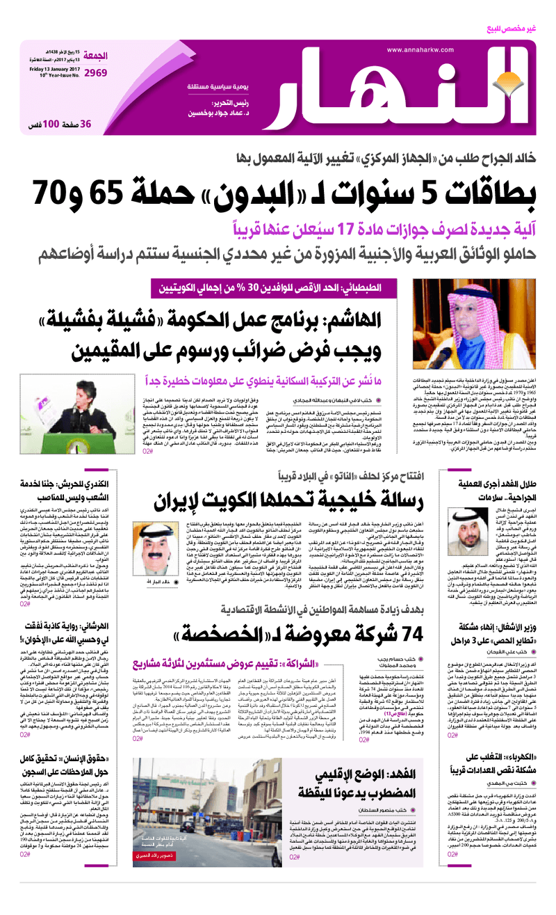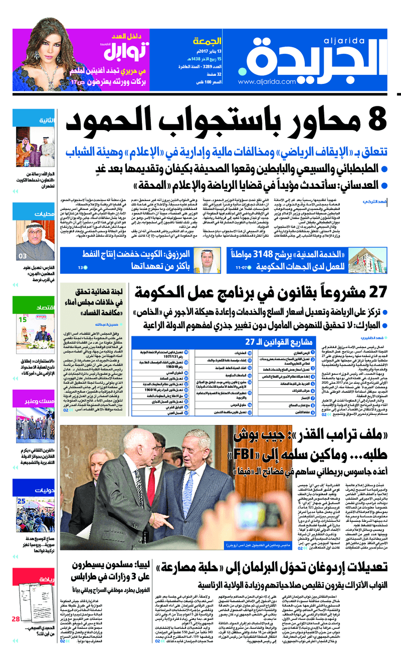 آخر الأخبار جرائم وقضايا “الجمارك” تضبط 29 ألف علبة مشروبات كحولية قادمة من دولة آسيوية في ميناء الشويخ 9 يونيو، 2024 محليات ممثلة عن دولة الكويت الطبيبة الكويتية أسماء الكندري تشارك في المؤتمر العالمي للمناظير في إيطاليا 8 يونيو، 2024 محليات “الصحة”: اكتمال وصول فريق الخدمات الطبية ببعثة الحج الكويتية لمكة المكرمة 8 يونيو، 2024 محليات “الصحة” تحدد 8 مراكز للصحة المدرسية لاستقبال الطلبة المبتعثين 8 يونيو، 2024 عربي وعالمي “الصحة العالمية”: تسجيل أول وفاة لشخص مصاب بـ«أنفلونزا الطيور» 7 يونيو، 2024 محليات عناوين الصحف الكويتية ليوم الجمعة 13 يناير 2017 محرر المحليات13 يناير، 2017أضف تعليق1 دقائق جريدة الجريدة جريدة الأنباء جريدة القبس جريدة السياسة جريدة الوطن جريدة الراي جريدة النهار الوسومTop عناوين الصحف المحلية من الممكن أن يعجبك جرائم وقضايا “الجمارك” تضبط 29 ألف علبة مشروبات كحولية قادمة من دولة آسيوية في ميناء الشويخ محليات ممثلة عن دولة الكويت الطبيبة الكويتية أسماء الكندري تشارك في المؤتمر العالمي للمناظير في إيطاليا محليات “الصحة”: اكتمال وصول فريق الخدمات الطبية ببعثة الحج الكويتية لمكة المكرمة محليات “الصحة” تحدد 8 مراكز للصحة المدرسية لاستقبال الطلبة المبتعثين عربي وعالمي “الصحة العالمية”: تسجيل أول وفاة لشخص مصاب بـ«أنفلونزا الطيور» تكنولوجيا رش السحب بملح البحر.. تجربة “ثورية” لتبريد كوكب الأرض أضف تعليق أضغط هنا لإضافة تعليق إلغاء الردالتعليقالاسم البريد الإلكتروني الموقع الإلكتروني Δ هذا الموقع يستخدم خدمة أكيسميت للتقليل من البريد المزعجة. اعرف المزيد عن كيفية التعامل مع بيانات التعليقات الخاصة بك processed.