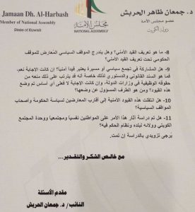 وقال الحربش في تساؤلاته : هل تمت مراسلة وزارات الدولة وجهاتها المتعددة، وتزويد هذه الجهات بمعلومات أو قيود حالت دون تعيين الكويتيين في وظائف إشرافية يستحقونها في هذه الجهات والوزارات؟ وهل انتقلت هذه القيود الأمنية إلى أقارب المعارضين لسياسة الحكومة وأصحاب المواقف السياسية؟’.