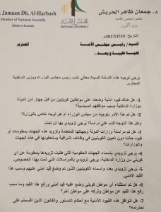 وجه النائب د. جمعان الحربش مجموعة من الأسئلة البرلمانية لنائب رئيس مجلس الوزراء وزير الداخلية الشيخ خالد الجراح تضمنت طلبه بافادته عما إذا كان هناك قيوداً أمنية وضعت على مواطنين كويتيين من قبل جهاز أمن الدولة في وزارة الداخلية بسبب مواقفهم السياسية؟ وهل تم هذا الأمر بتوجيه من مجلس الوزراء، أم هو توجه خاص بالوزارة’.