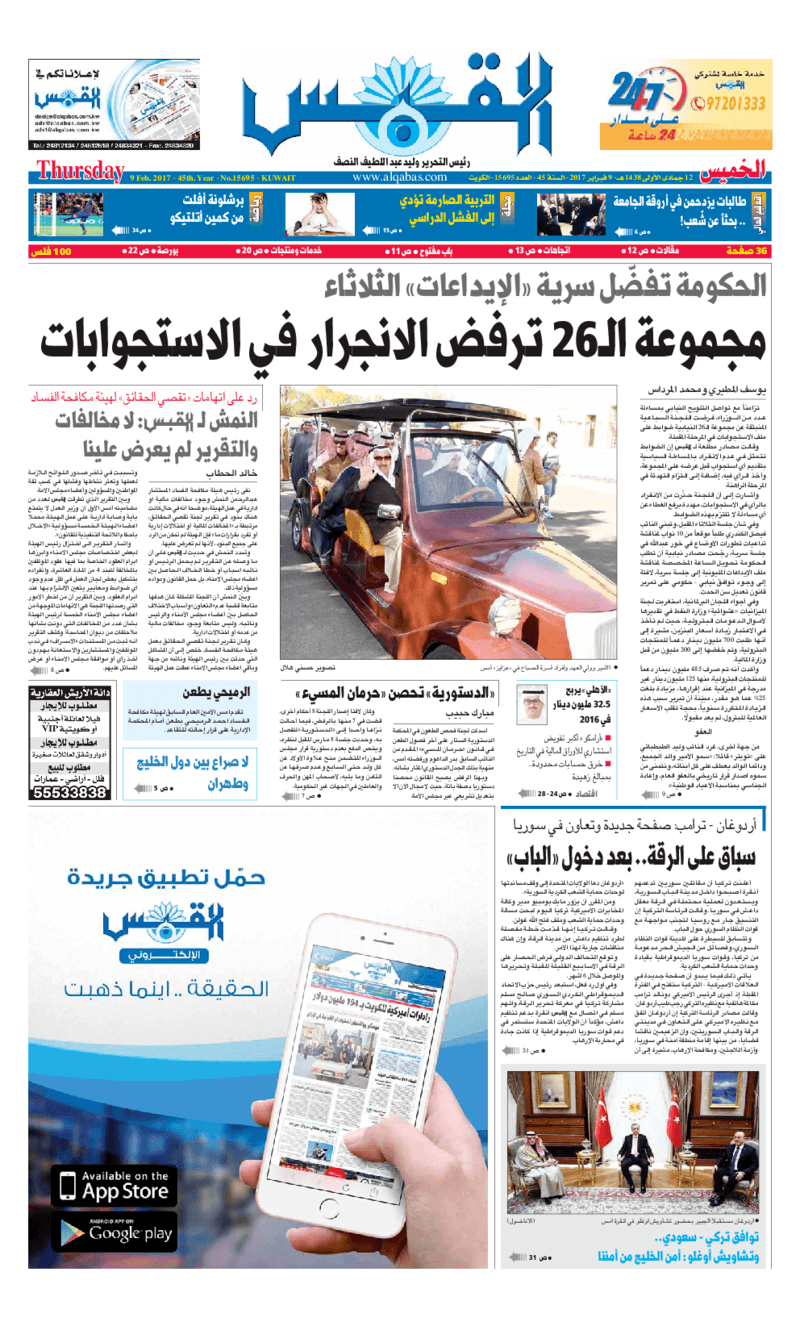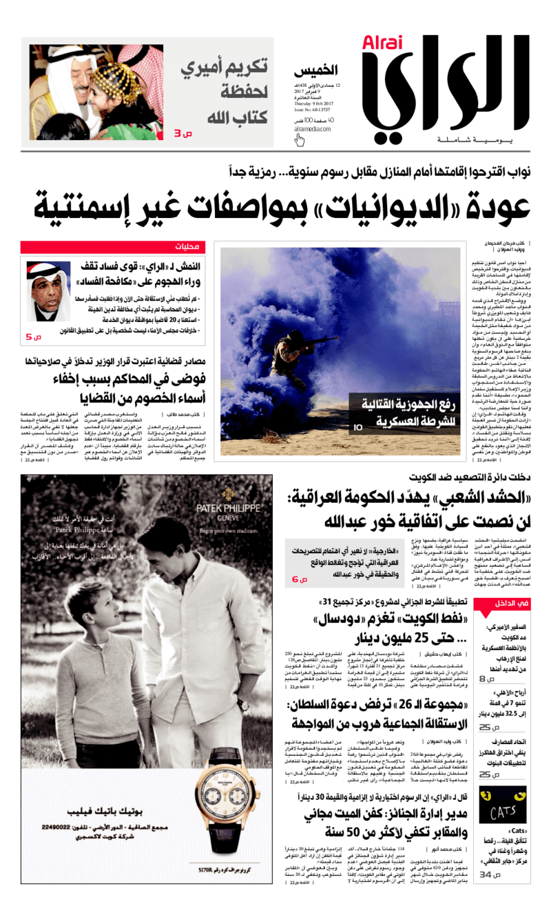 آخر الأخبار جرائم وقضايا “الجمارك” تضبط 29 ألف علبة مشروبات كحولية قادمة من دولة آسيوية في ميناء الشويخ 9 يونيو، 2024 محليات ممثلة عن دولة الكويت الطبيبة الكويتية أسماء الكندري تشارك في المؤتمر العالمي للمناظير في إيطاليا 8 يونيو، 2024 محليات “الصحة”: اكتمال وصول فريق الخدمات الطبية ببعثة الحج الكويتية لمكة المكرمة 8 يونيو، 2024 محليات “الصحة” تحدد 8 مراكز للصحة المدرسية لاستقبال الطلبة المبتعثين 8 يونيو، 2024 عربي وعالمي “الصحة العالمية”: تسجيل أول وفاة لشخص مصاب بـ«أنفلونزا الطيور» 7 يونيو، 2024 محليات عناوين الصحف الكويتية ليوم الخميس 09 فبراير 2017 محرر المحليات9 فبراير، 2017أضف تعليق1 دقائق جريدة الجريدة جريدة الأنباء جريدة القبس جريدة السياسة جريدة الوطن جريدة الراي جريدة الوسط جريدة النهار الوسومTop عناوين الصحف المحلية من الممكن أن يعجبك جرائم وقضايا “الجمارك” تضبط 29 ألف علبة مشروبات كحولية قادمة من دولة آسيوية في ميناء الشويخ محليات ممثلة عن دولة الكويت الطبيبة الكويتية أسماء الكندري تشارك في المؤتمر العالمي للمناظير في إيطاليا محليات “الصحة”: اكتمال وصول فريق الخدمات الطبية ببعثة الحج الكويتية لمكة المكرمة محليات “الصحة” تحدد 8 مراكز للصحة المدرسية لاستقبال الطلبة المبتعثين عربي وعالمي “الصحة العالمية”: تسجيل أول وفاة لشخص مصاب بـ«أنفلونزا الطيور» تكنولوجيا رش السحب بملح البحر.. تجربة “ثورية” لتبريد كوكب الأرض أضف تعليق أضغط هنا لإضافة تعليق إلغاء الردالتعليقالاسم البريد الإلكتروني الموقع الإلكتروني Δ هذا الموقع يستخدم خدمة أكيسميت للتقليل من البريد المزعجة. اعرف المزيد عن كيفية التعامل مع بيانات التعليقات الخاصة بك processed.
