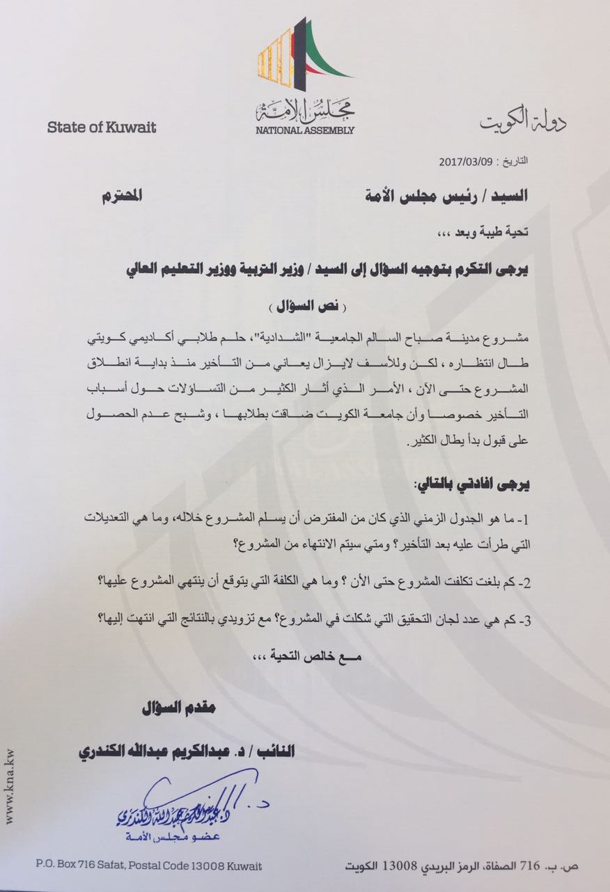 وقال الكندري في نص السؤال “مشروع مدينة صباح السالم (الشدادية)، حلم طلابي أكاديمي كويتي طال انتظاره، لكن وللأسف لا يزال يعاني من التأخير منذ بداية انطلاق المشروع حتى الآن، الأمر الذي أثار الكثير من التساؤلات حول أسباب التأخير خصوصا وأن جامعة الكويت ضاقت بطلابها، وشبح عدم الحصول على قبول بدأ يطال الكثير”.