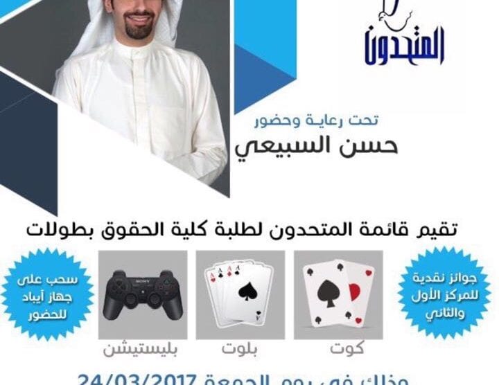 تنظم قائمة المتحدون لطلبة كلية الحقوق بطولات متنوعة وذلك اليوم الجمعة الموافق ٢٤ / ٣/ ٢٠١٧ .