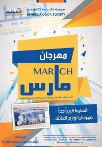 تفتتح جمعية أشبيلية التعاونية غدا الأحد مهرجان مارس بتخفيضات كبيرة على ٢٠٠ سلعة .