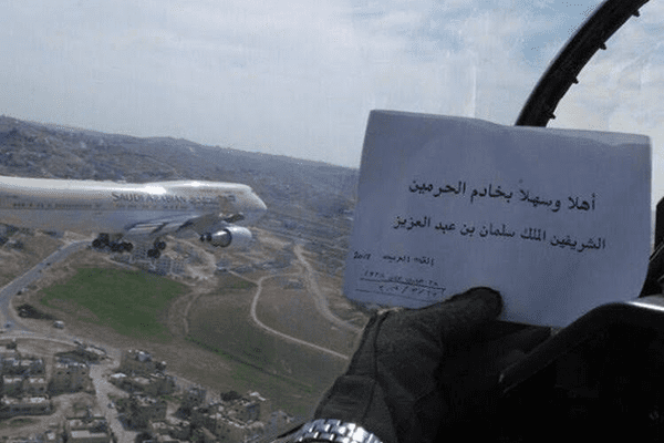 تداولت مواقع التواصل الاجتماعي، صورة لطيار أردني يرحب بخادم الحرمين الشريفين الملك سلمان بن عبدالعزيز بطريقته الخاصة، لدى وصوله داخل الحدود الجوية الأردنية، عبر رسالة ترحيبية دونها من داخل مقصورة القيادة لطائرة سلاح الجوّ.