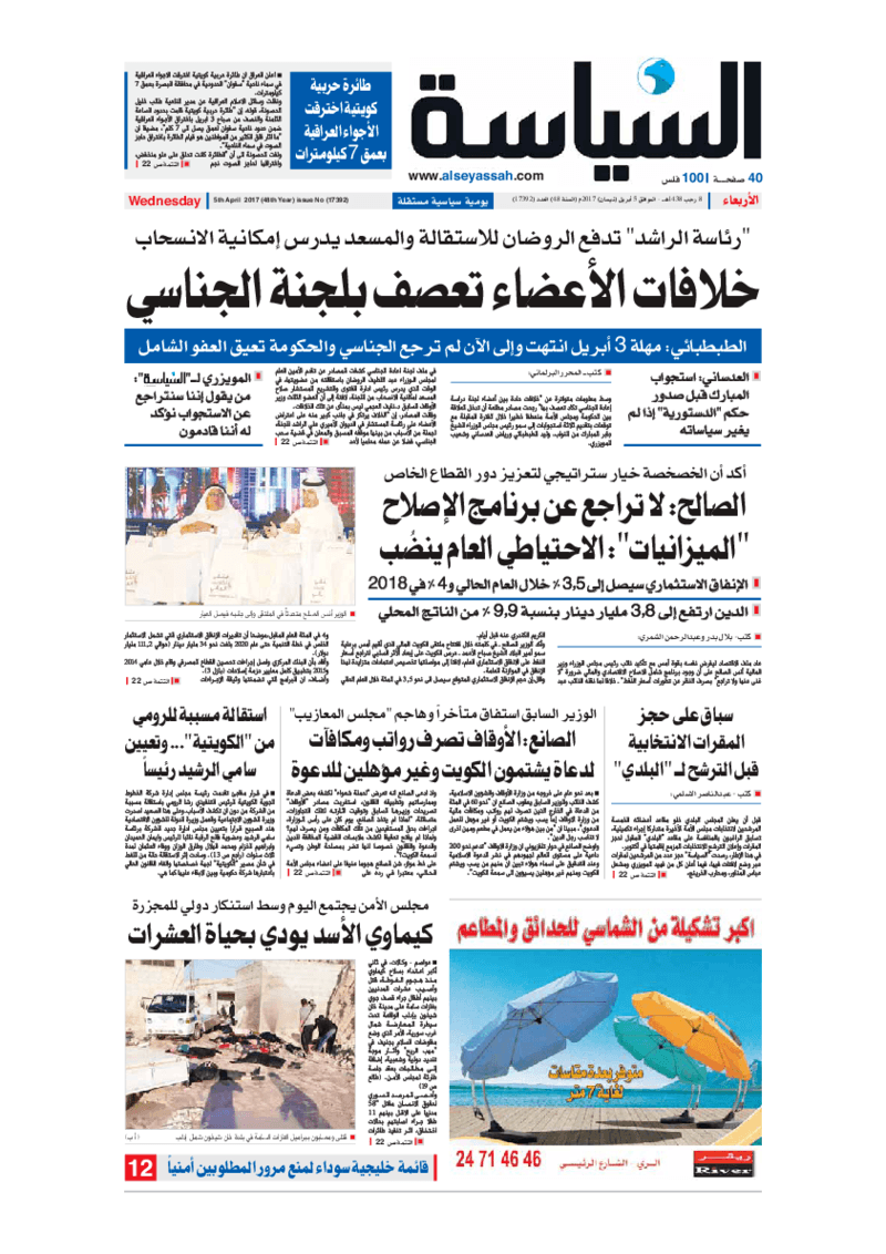 آخر الأخبار جرائم وقضايا “الجمارك” تضبط 29 ألف علبة مشروبات كحولية قادمة من دولة آسيوية في ميناء الشويخ 9 يونيو، 2024 محليات ممثلة عن دولة الكويت الطبيبة الكويتية أسماء الكندري تشارك في المؤتمر العالمي للمناظير في إيطاليا 8 يونيو، 2024 محليات “الصحة”: اكتمال وصول فريق الخدمات الطبية ببعثة الحج الكويتية لمكة المكرمة 8 يونيو، 2024 محليات “الصحة” تحدد 8 مراكز للصحة المدرسية لاستقبال الطلبة المبتعثين 8 يونيو، 2024 عربي وعالمي “الصحة العالمية”: تسجيل أول وفاة لشخص مصاب بـ«أنفلونزا الطيور» 7 يونيو، 2024 محليات عناوين الصحف الكويتية ليوم الأربعاء 05 أبريل 2017 محرر المحليات5 أبريل، 2017أضف تعليق1 دقائق جريدة الجريدة جريدة الأنباء جريدة السياسة جريدة الراي جريدة الوسط جريدة النهار الوسومTop عناوين الصحف المحلية من الممكن أن يعجبك جرائم وقضايا “الجمارك” تضبط 29 ألف علبة مشروبات كحولية قادمة من دولة آسيوية في ميناء الشويخ محليات ممثلة عن دولة الكويت الطبيبة الكويتية أسماء الكندري تشارك في المؤتمر العالمي للمناظير في إيطاليا محليات “الصحة”: اكتمال وصول فريق الخدمات الطبية ببعثة الحج الكويتية لمكة المكرمة محليات “الصحة” تحدد 8 مراكز للصحة المدرسية لاستقبال الطلبة المبتعثين عربي وعالمي “الصحة العالمية”: تسجيل أول وفاة لشخص مصاب بـ«أنفلونزا الطيور» تكنولوجيا رش السحب بملح البحر.. تجربة “ثورية” لتبريد كوكب الأرض أضف تعليق أضغط هنا لإضافة تعليق إلغاء الردالتعليقالاسم البريد الإلكتروني الموقع الإلكتروني Δ هذا الموقع يستخدم خدمة أكيسميت للتقليل من البريد المزعجة. اعرف المزيد عن كيفية التعامل مع بيانات التعليقات الخاصة بك processed.