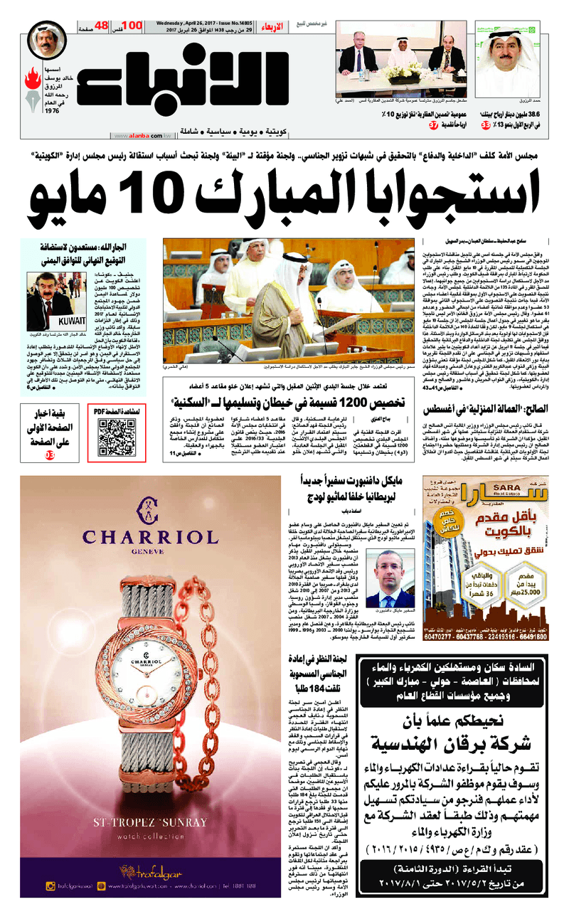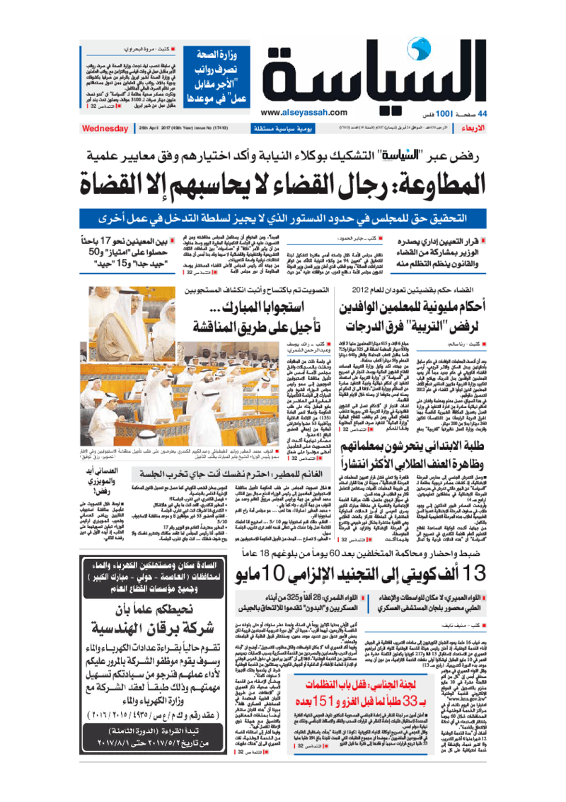 عناوين الصحف الكويتية ليوم الأربعاء 26 أبريل 2017