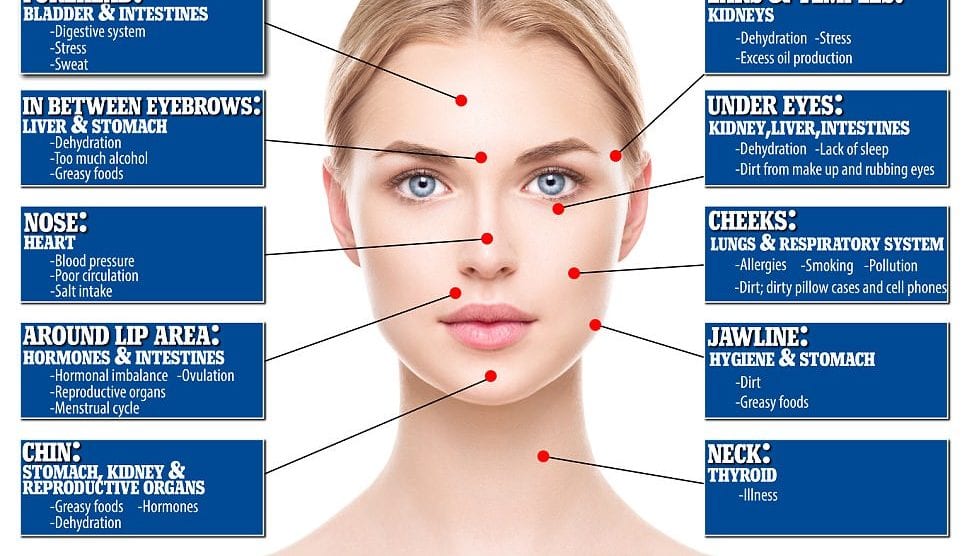 وبالنسبة لأطباء الأمراض الجلدية، فإن البثور والعيوب وشحوب الوجه تعد مؤشرات لها علاقة بمسائل صحية، وكل منطقة من الوجه تعد مؤشراً لمشكلة صحية معينة، حسب ما جاء في صحيفة” ديلي ميل”.