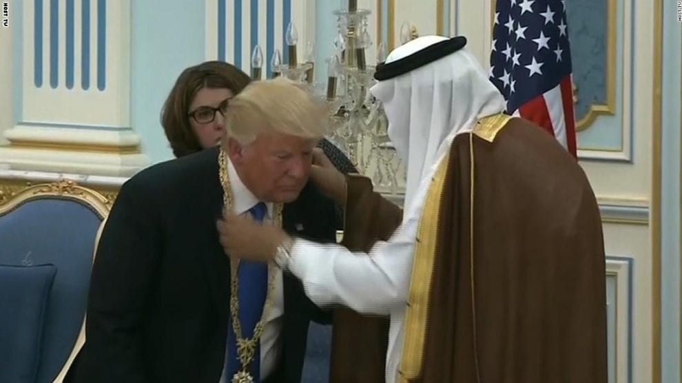 على الرغم من أن الرئيس الأمريكى دونالد ترامب سبق وانتقد سلفه باراك أوباما لانحنائه أمام العاهل السعودى الراحل الملك عبد الله بن عبد العزيز، إلا أن صورته وهو ينحنى بدوره أمام الملك سلمان وهو يهديه ميدالية تكريمية قد تسببت فى عاصفة من الانتقادات ضده.