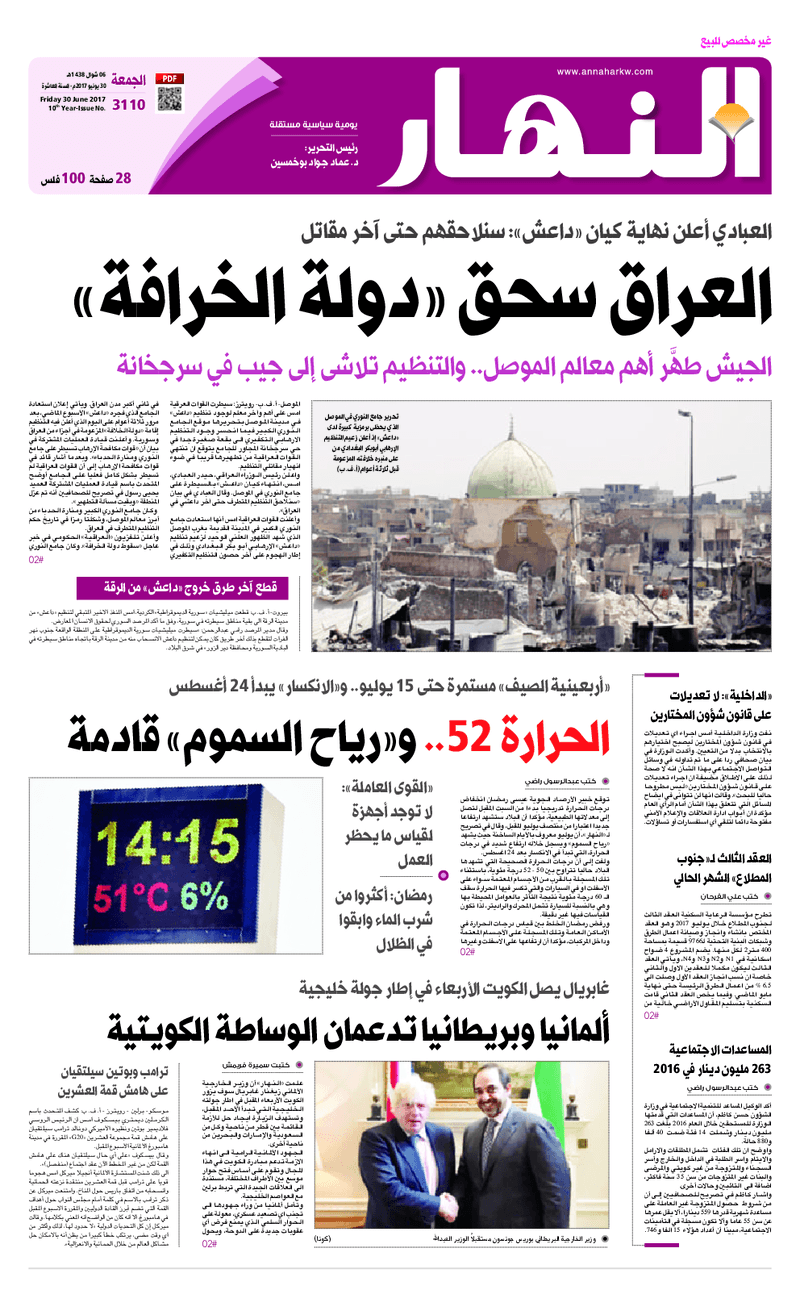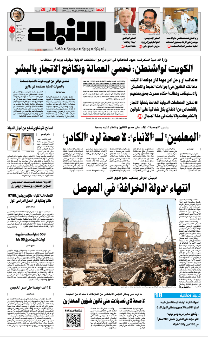 آخر الأخبار جرائم وقضايا “الجمارك” تضبط 29 ألف علبة مشروبات كحولية قادمة من دولة آسيوية في ميناء الشويخ 9 يونيو، 2024 محليات ممثلة عن دولة الكويت الطبيبة الكويتية أسماء الكندري تشارك في المؤتمر العالمي للمناظير في إيطاليا 8 يونيو، 2024 محليات “الصحة”: اكتمال وصول فريق الخدمات الطبية ببعثة الحج الكويتية لمكة المكرمة 8 يونيو، 2024 محليات “الصحة” تحدد 8 مراكز للصحة المدرسية لاستقبال الطلبة المبتعثين 8 يونيو، 2024 عربي وعالمي “الصحة العالمية”: تسجيل أول وفاة لشخص مصاب بـ«أنفلونزا الطيور» 7 يونيو، 2024 محليات عناوين الصحف الكويتية ليوم الجمعة 30 يونيو 2017 محرر المحليات30 يونيو، 2017أضف تعليق1 دقائق جريدة الجريدة جريدة الأنباء جريدة الوطن جريدة الراي جريدة النهار الوسومTop عناوين الصحف المحلية من الممكن أن يعجبك جرائم وقضايا “الجمارك” تضبط 29 ألف علبة مشروبات كحولية قادمة من دولة آسيوية في ميناء الشويخ محليات ممثلة عن دولة الكويت الطبيبة الكويتية أسماء الكندري تشارك في المؤتمر العالمي للمناظير في إيطاليا محليات “الصحة”: اكتمال وصول فريق الخدمات الطبية ببعثة الحج الكويتية لمكة المكرمة محليات “الصحة” تحدد 8 مراكز للصحة المدرسية لاستقبال الطلبة المبتعثين عربي وعالمي “الصحة العالمية”: تسجيل أول وفاة لشخص مصاب بـ«أنفلونزا الطيور» تكنولوجيا رش السحب بملح البحر.. تجربة “ثورية” لتبريد كوكب الأرض أضف تعليق أضغط هنا لإضافة تعليق إلغاء الردالتعليقالاسم البريد الإلكتروني الموقع الإلكتروني Δ هذا الموقع يستخدم خدمة أكيسميت للتقليل من البريد المزعجة. اعرف المزيد عن كيفية التعامل مع بيانات التعليقات الخاصة بك processed.