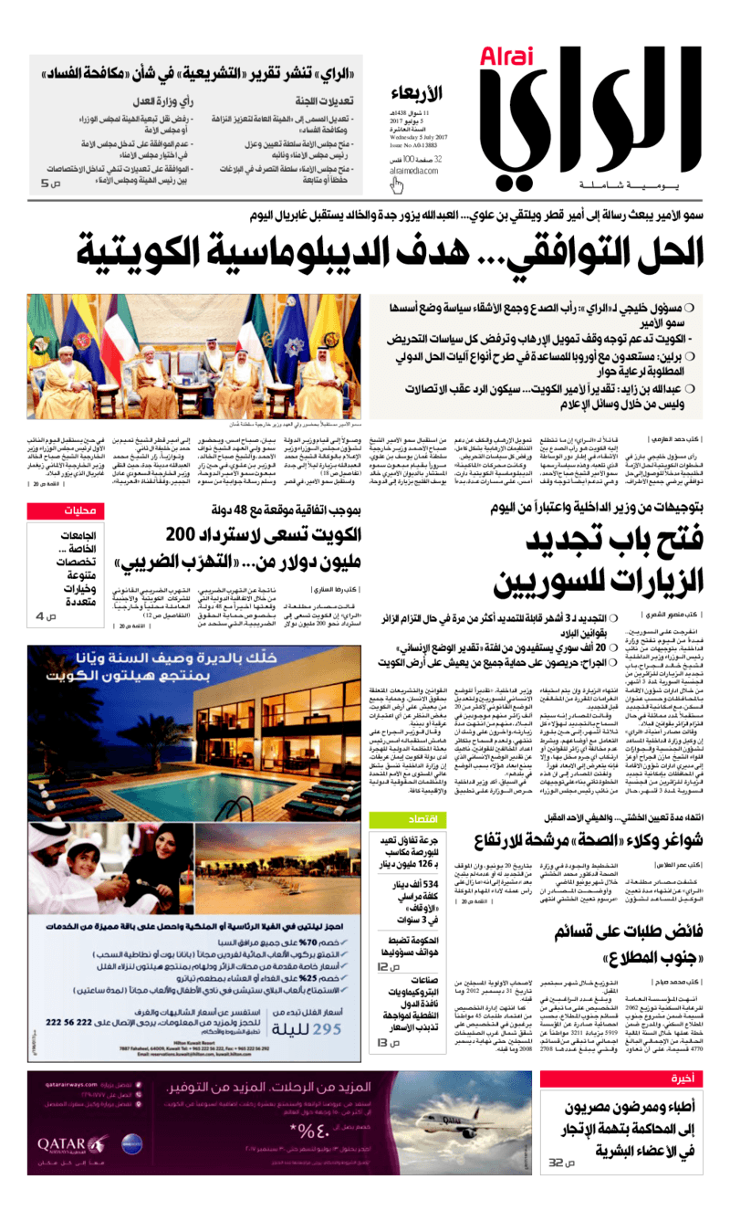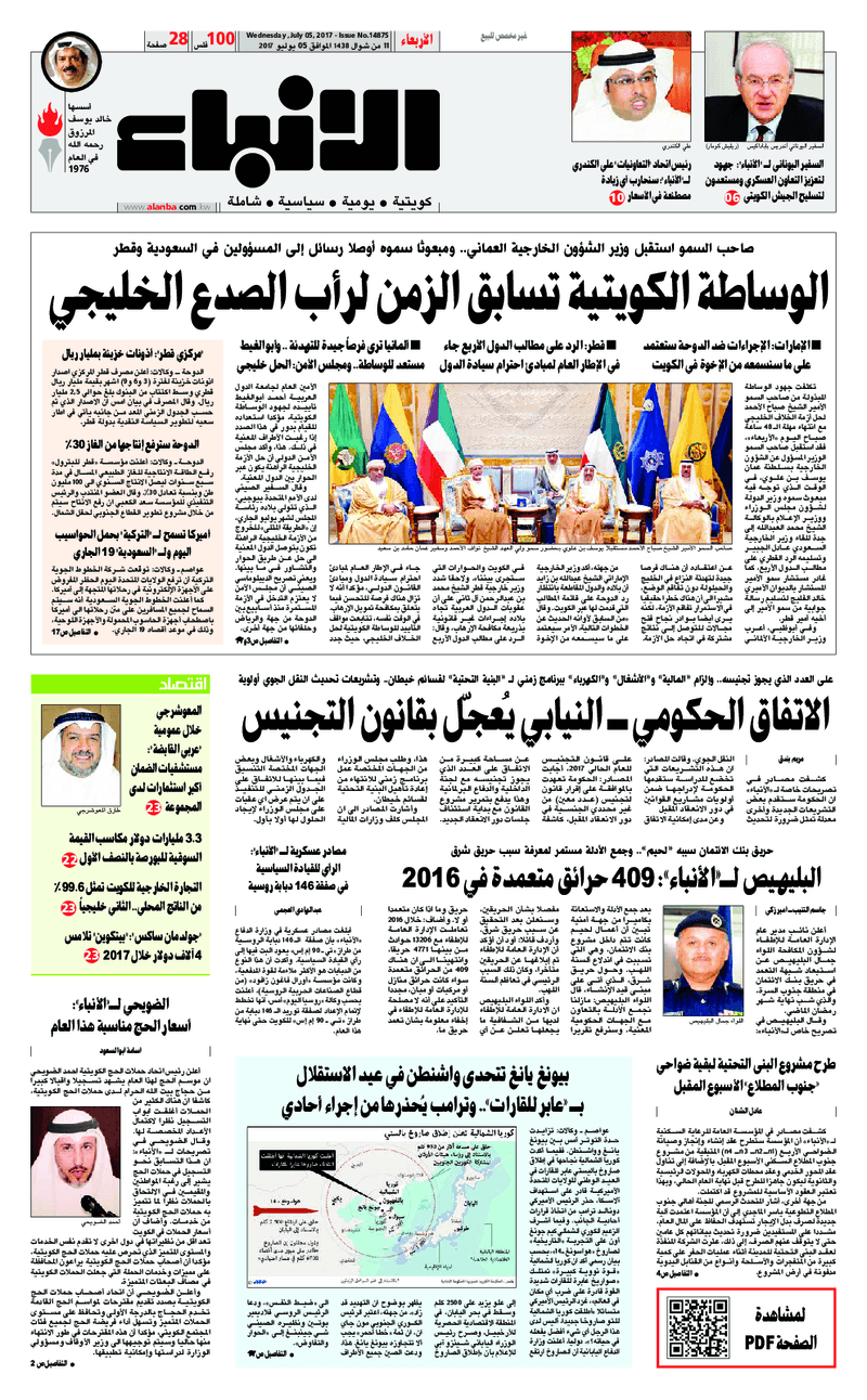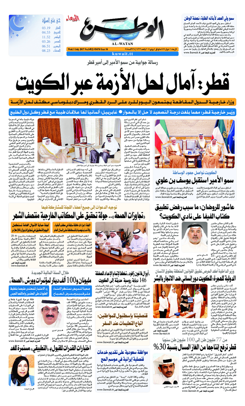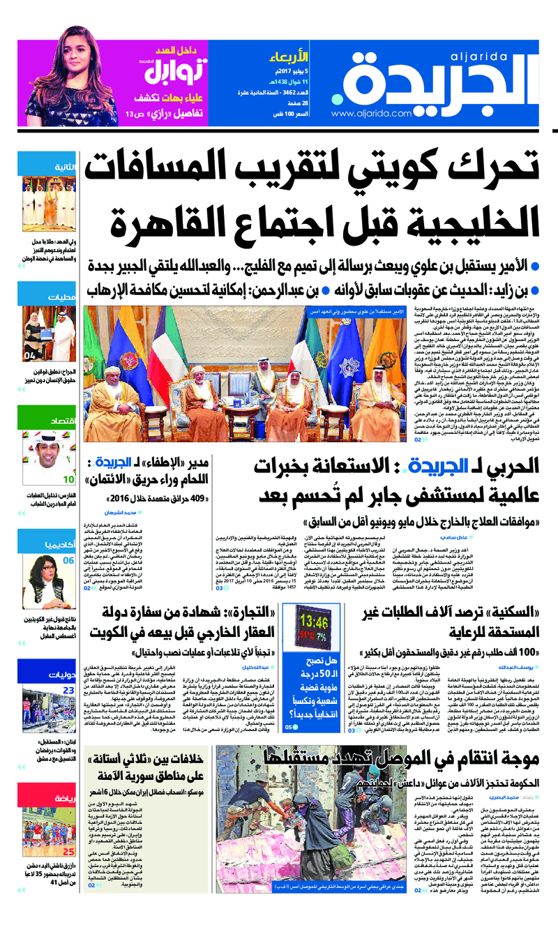 آخر الأخبار جرائم وقضايا “الجمارك” تضبط 29 ألف علبة مشروبات كحولية قادمة من دولة آسيوية في ميناء الشويخ 9 يونيو، 2024 محليات ممثلة عن دولة الكويت الطبيبة الكويتية أسماء الكندري تشارك في المؤتمر العالمي للمناظير في إيطاليا 8 يونيو، 2024 محليات “الصحة”: اكتمال وصول فريق الخدمات الطبية ببعثة الحج الكويتية لمكة المكرمة 8 يونيو، 2024 محليات “الصحة” تحدد 8 مراكز للصحة المدرسية لاستقبال الطلبة المبتعثين 8 يونيو، 2024 عربي وعالمي “الصحة العالمية”: تسجيل أول وفاة لشخص مصاب بـ«أنفلونزا الطيور» 7 يونيو، 2024 محليات عناوين الصحف الكويتية ليوم الأربعاء 05 يوليو 2017 محرر المحليات5 يوليو، 2017أضف تعليق1 دقائق جريدة الجريدة جريدة الأنباء جريدة الوطن جريدة الراي جريدة الوسط الوسومTop عناوين الصحف المحلية من الممكن أن يعجبك جرائم وقضايا “الجمارك” تضبط 29 ألف علبة مشروبات كحولية قادمة من دولة آسيوية في ميناء الشويخ محليات ممثلة عن دولة الكويت الطبيبة الكويتية أسماء الكندري تشارك في المؤتمر العالمي للمناظير في إيطاليا محليات “الصحة”: اكتمال وصول فريق الخدمات الطبية ببعثة الحج الكويتية لمكة المكرمة محليات “الصحة” تحدد 8 مراكز للصحة المدرسية لاستقبال الطلبة المبتعثين عربي وعالمي “الصحة العالمية”: تسجيل أول وفاة لشخص مصاب بـ«أنفلونزا الطيور» تكنولوجيا رش السحب بملح البحر.. تجربة “ثورية” لتبريد كوكب الأرض أضف تعليق أضغط هنا لإضافة تعليق إلغاء الردالتعليقالاسم البريد الإلكتروني الموقع الإلكتروني Δ هذا الموقع يستخدم خدمة أكيسميت للتقليل من البريد المزعجة. اعرف المزيد عن كيفية التعامل مع بيانات التعليقات الخاصة بك processed.