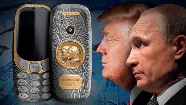 والهاتف عبارة عن “نوكيا 3310” التاريخي في نسخته الجديدة الذكية التي تم إصدارها حديثاً، ويتضمن غلافه صورة من الذهب تجمع الرئيسين الأميركي والروسي.