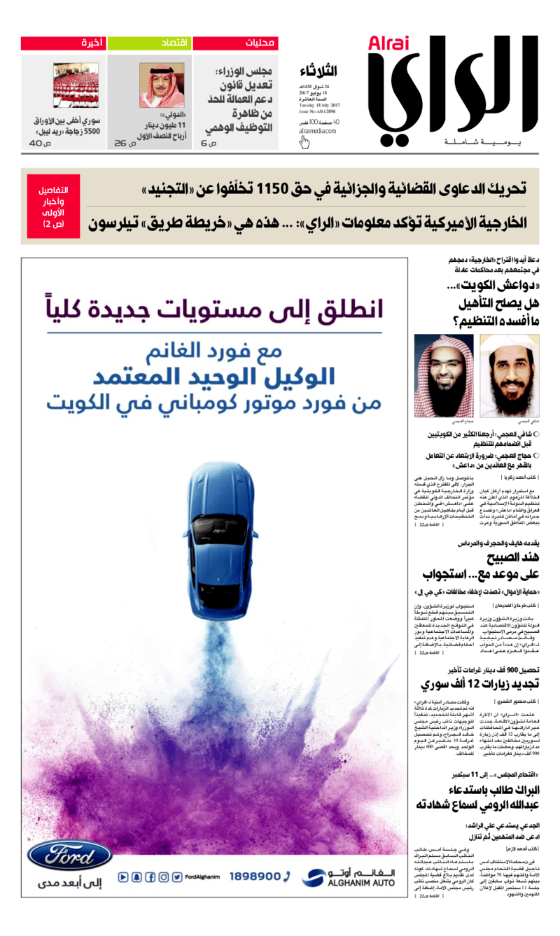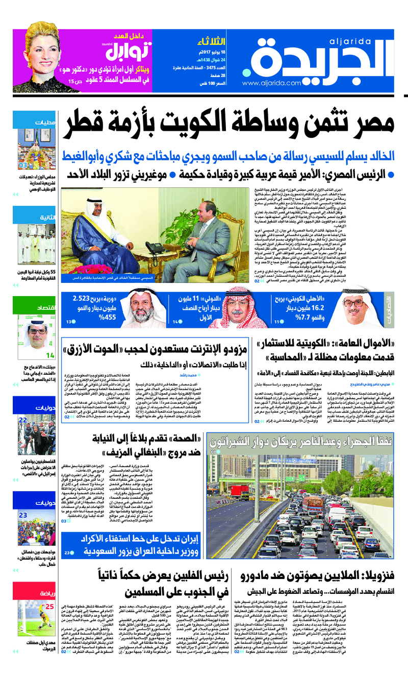 آخر الأخبار جرائم وقضايا “الجمارك” تضبط 29 ألف علبة مشروبات كحولية قادمة من دولة آسيوية في ميناء الشويخ 9 يونيو، 2024 محليات ممثلة عن دولة الكويت الطبيبة الكويتية أسماء الكندري تشارك في المؤتمر العالمي للمناظير في إيطاليا 8 يونيو، 2024 محليات “الصحة”: اكتمال وصول فريق الخدمات الطبية ببعثة الحج الكويتية لمكة المكرمة 8 يونيو، 2024 محليات “الصحة” تحدد 8 مراكز للصحة المدرسية لاستقبال الطلبة المبتعثين 8 يونيو، 2024 عربي وعالمي “الصحة العالمية”: تسجيل أول وفاة لشخص مصاب بـ«أنفلونزا الطيور» 7 يونيو، 2024 محليات عناوين الصحف الكويتية ليوم الثلاثاء 18 يوليو 2017 محرر المحليات18 يوليو، 2017أضف تعليق1 دقائق جريدة الجريدة جريدة الأنباء جريدة الوطن جريدة الراي جريدة الوسط الوسومTop عناوين الصحف المحلية من الممكن أن يعجبك جرائم وقضايا “الجمارك” تضبط 29 ألف علبة مشروبات كحولية قادمة من دولة آسيوية في ميناء الشويخ محليات ممثلة عن دولة الكويت الطبيبة الكويتية أسماء الكندري تشارك في المؤتمر العالمي للمناظير في إيطاليا محليات “الصحة”: اكتمال وصول فريق الخدمات الطبية ببعثة الحج الكويتية لمكة المكرمة محليات “الصحة” تحدد 8 مراكز للصحة المدرسية لاستقبال الطلبة المبتعثين عربي وعالمي “الصحة العالمية”: تسجيل أول وفاة لشخص مصاب بـ«أنفلونزا الطيور» تكنولوجيا رش السحب بملح البحر.. تجربة “ثورية” لتبريد كوكب الأرض أضف تعليق أضغط هنا لإضافة تعليق إلغاء الردالتعليقالاسم البريد الإلكتروني الموقع الإلكتروني Δ هذا الموقع يستخدم خدمة أكيسميت للتقليل من البريد المزعجة. اعرف المزيد عن كيفية التعامل مع بيانات التعليقات الخاصة بك processed.