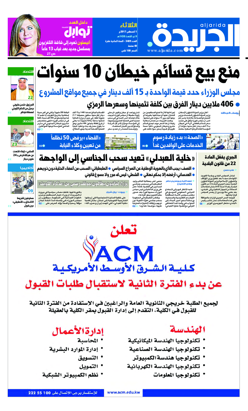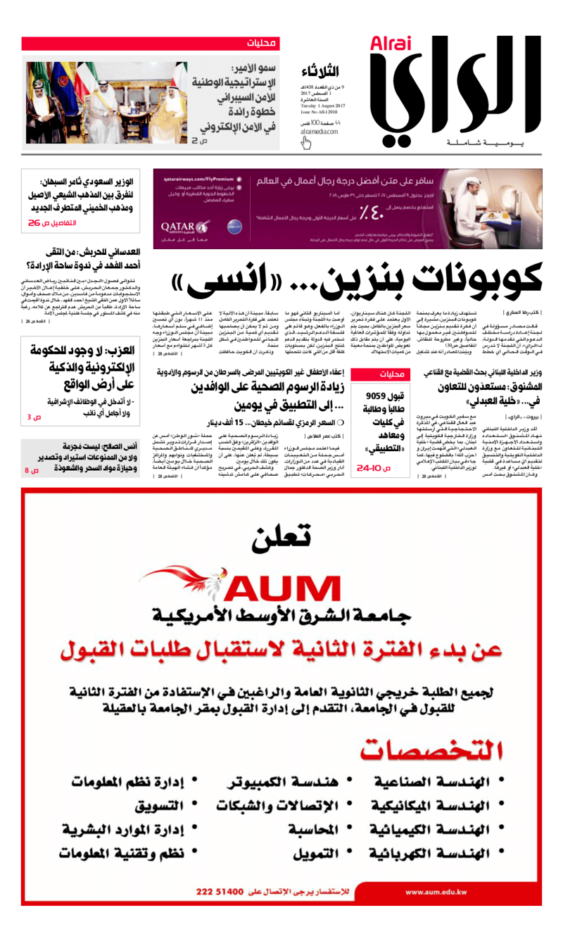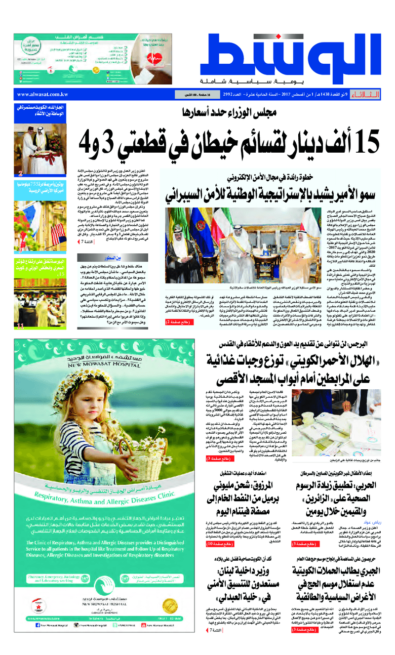 آخر الأخبار جرائم وقضايا “الجمارك” تضبط 29 ألف علبة مشروبات كحولية قادمة من دولة آسيوية في ميناء الشويخ 9 يونيو، 2024 محليات ممثلة عن دولة الكويت الطبيبة الكويتية أسماء الكندري تشارك في المؤتمر العالمي للمناظير في إيطاليا 8 يونيو، 2024 محليات “الصحة”: اكتمال وصول فريق الخدمات الطبية ببعثة الحج الكويتية لمكة المكرمة 8 يونيو، 2024 محليات “الصحة” تحدد 8 مراكز للصحة المدرسية لاستقبال الطلبة المبتعثين 8 يونيو، 2024 عربي وعالمي “الصحة العالمية”: تسجيل أول وفاة لشخص مصاب بـ«أنفلونزا الطيور» 7 يونيو، 2024 محليات عناوين الصحف الكويتية ليوم الثلاثاء 01 أغسطس 2017 محرر المحليات1 أغسطس، 2017أضف تعليق1 دقائق جريدة الجريدة جريدة الأنباء جريدة الراي جريدة الوسط الوسومTop عناوين الصحف المحلية من الممكن أن يعجبك جرائم وقضايا “الجمارك” تضبط 29 ألف علبة مشروبات كحولية قادمة من دولة آسيوية في ميناء الشويخ محليات ممثلة عن دولة الكويت الطبيبة الكويتية أسماء الكندري تشارك في المؤتمر العالمي للمناظير في إيطاليا محليات “الصحة”: اكتمال وصول فريق الخدمات الطبية ببعثة الحج الكويتية لمكة المكرمة محليات “الصحة” تحدد 8 مراكز للصحة المدرسية لاستقبال الطلبة المبتعثين عربي وعالمي “الصحة العالمية”: تسجيل أول وفاة لشخص مصاب بـ«أنفلونزا الطيور» تكنولوجيا رش السحب بملح البحر.. تجربة “ثورية” لتبريد كوكب الأرض أضف تعليق أضغط هنا لإضافة تعليق إلغاء الردالتعليقالاسم البريد الإلكتروني الموقع الإلكتروني Δ هذا الموقع يستخدم خدمة أكيسميت للتقليل من البريد المزعجة. اعرف المزيد عن كيفية التعامل مع بيانات التعليقات الخاصة بك processed.