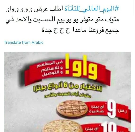 ونشرت الشركة، الأحد 22 أكتوبر/تشرين الأول 2017، تغريدة على حسابها في موقع “تويتر” لإعلان جديد عن منتجاتها من البيتزا، لكنها كتبت الإعلان بطريقة قال سعوديون إنها تسخر من المصابين بـ”التأتأة”.