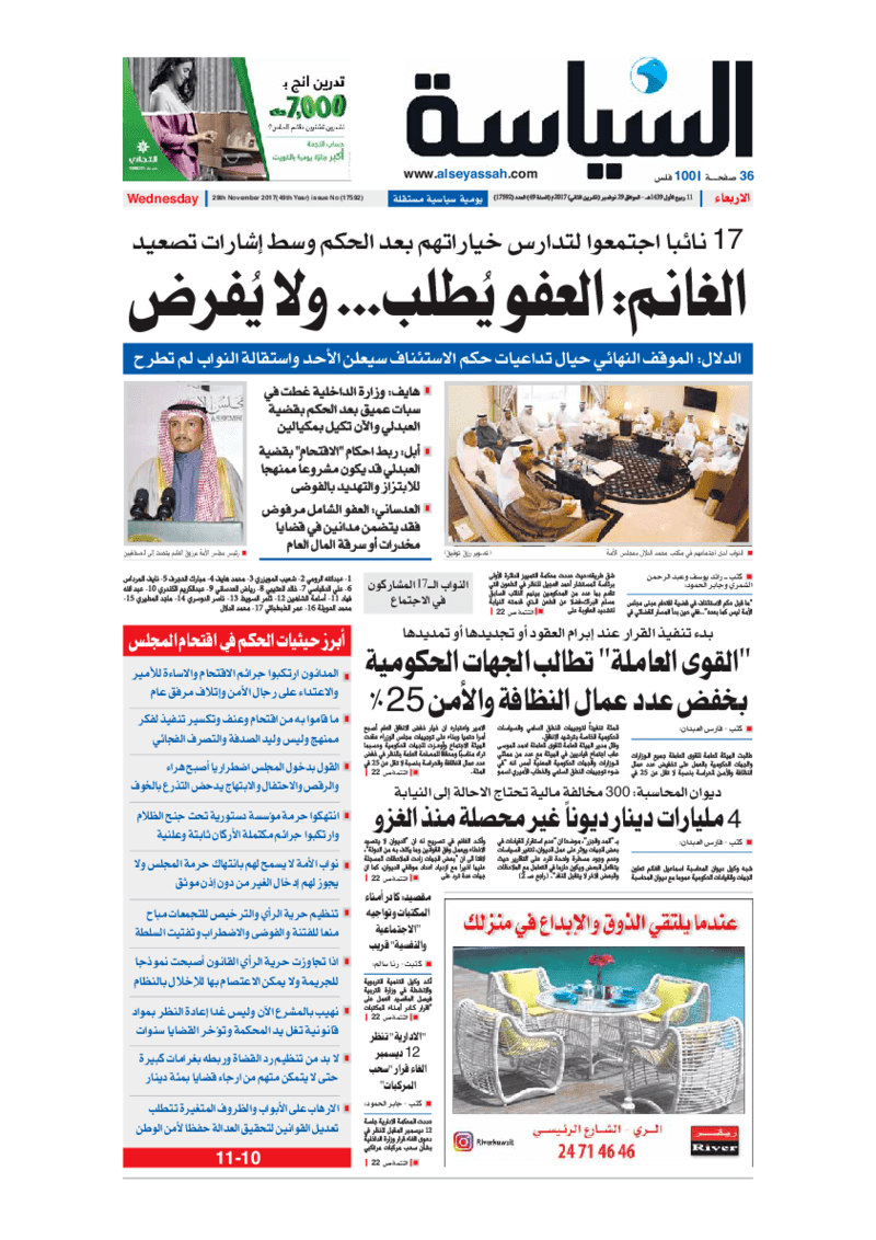 آخر الأخبار جرائم وقضايا “الجمارك” تضبط 29 ألف علبة مشروبات كحولية قادمة من دولة آسيوية في ميناء الشويخ 9 يونيو، 2024 محليات ممثلة عن دولة الكويت الطبيبة الكويتية أسماء الكندري تشارك في المؤتمر العالمي للمناظير في إيطاليا 8 يونيو، 2024 محليات “الصحة”: اكتمال وصول فريق الخدمات الطبية ببعثة الحج الكويتية لمكة المكرمة 8 يونيو، 2024 محليات “الصحة” تحدد 8 مراكز للصحة المدرسية لاستقبال الطلبة المبتعثين 8 يونيو، 2024 عربي وعالمي “الصحة العالمية”: تسجيل أول وفاة لشخص مصاب بـ«أنفلونزا الطيور» 7 يونيو، 2024 محليات عناوين الصحف الكويتية ليوم الأربعاء 29 نوفمبر 2017 محرر المحليات29 نوفمبر، 2017أضف تعليق1 دقائق جريدة الجريدة جريدة الأنباء جريدة السياسة جريدة الوطن جريدة الراي جريدة النهار الوسومTop عناوين الصحف المحلية من الممكن أن يعجبك جرائم وقضايا “الجمارك” تضبط 29 ألف علبة مشروبات كحولية قادمة من دولة آسيوية في ميناء الشويخ محليات ممثلة عن دولة الكويت الطبيبة الكويتية أسماء الكندري تشارك في المؤتمر العالمي للمناظير في إيطاليا محليات “الصحة”: اكتمال وصول فريق الخدمات الطبية ببعثة الحج الكويتية لمكة المكرمة محليات “الصحة” تحدد 8 مراكز للصحة المدرسية لاستقبال الطلبة المبتعثين عربي وعالمي “الصحة العالمية”: تسجيل أول وفاة لشخص مصاب بـ«أنفلونزا الطيور» تكنولوجيا رش السحب بملح البحر.. تجربة “ثورية” لتبريد كوكب الأرض أضف تعليق أضغط هنا لإضافة تعليق إلغاء الردالتعليقالاسم البريد الإلكتروني الموقع الإلكتروني Δ هذا الموقع يستخدم خدمة أكيسميت للتقليل من البريد المزعجة. اعرف المزيد عن كيفية التعامل مع بيانات التعليقات الخاصة بك processed.