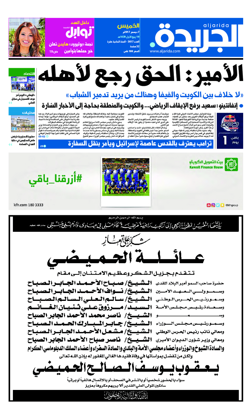 آخر الأخبار جرائم وقضايا “الجمارك” تضبط 29 ألف علبة مشروبات كحولية قادمة من دولة آسيوية في ميناء الشويخ 9 يونيو، 2024 محليات ممثلة عن دولة الكويت الطبيبة الكويتية أسماء الكندري تشارك في المؤتمر العالمي للمناظير في إيطاليا 8 يونيو، 2024 محليات “الصحة”: اكتمال وصول فريق الخدمات الطبية ببعثة الحج الكويتية لمكة المكرمة 8 يونيو، 2024 محليات “الصحة” تحدد 8 مراكز للصحة المدرسية لاستقبال الطلبة المبتعثين 8 يونيو، 2024 عربي وعالمي “الصحة العالمية”: تسجيل أول وفاة لشخص مصاب بـ«أنفلونزا الطيور» 7 يونيو، 2024 محليات عناوين الصحف الكويتية ليوم الخميس 07 ديسمبر 2017 محرر المحليات7 ديسمبر، 2017أضف تعليق1 دقائق جريدة الجريدة جريدة السياسة جريدة الراي جريدة النهار الوسومTop عناوين الصحف المحلية من الممكن أن يعجبك جرائم وقضايا “الجمارك” تضبط 29 ألف علبة مشروبات كحولية قادمة من دولة آسيوية في ميناء الشويخ محليات ممثلة عن دولة الكويت الطبيبة الكويتية أسماء الكندري تشارك في المؤتمر العالمي للمناظير في إيطاليا محليات “الصحة”: اكتمال وصول فريق الخدمات الطبية ببعثة الحج الكويتية لمكة المكرمة محليات “الصحة” تحدد 8 مراكز للصحة المدرسية لاستقبال الطلبة المبتعثين عربي وعالمي “الصحة العالمية”: تسجيل أول وفاة لشخص مصاب بـ«أنفلونزا الطيور» تكنولوجيا رش السحب بملح البحر.. تجربة “ثورية” لتبريد كوكب الأرض أضف تعليق أضغط هنا لإضافة تعليق إلغاء الردالتعليقالاسم البريد الإلكتروني الموقع الإلكتروني Δ هذا الموقع يستخدم خدمة أكيسميت للتقليل من البريد المزعجة. اعرف المزيد عن كيفية التعامل مع بيانات التعليقات الخاصة بك processed.