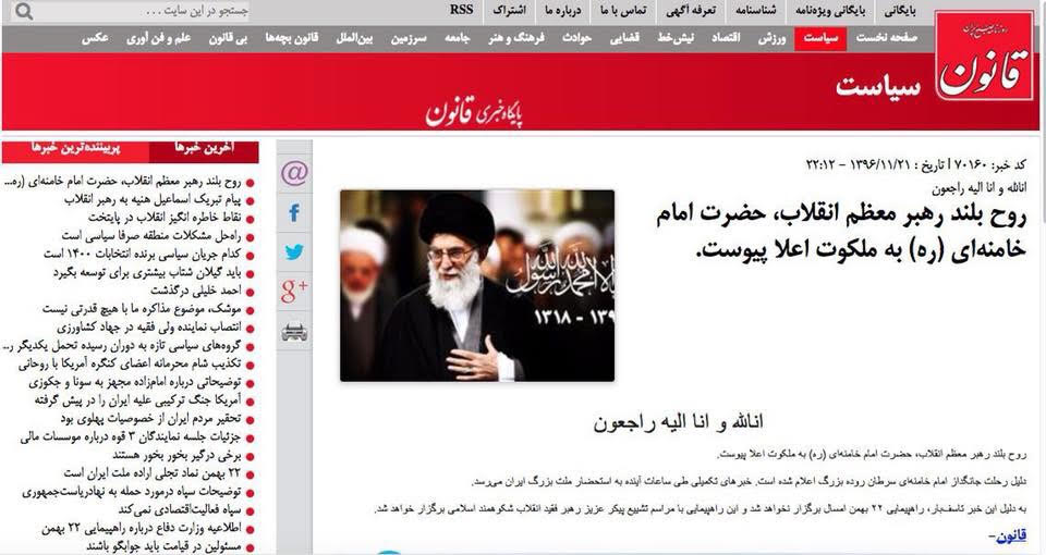 أعلنت صحيفة “قانون”، السبت، المقربة من الحكومة الإيرانية عن وفاة المرشد الأعلى للثورة الإيرانية، علي خامنئي.