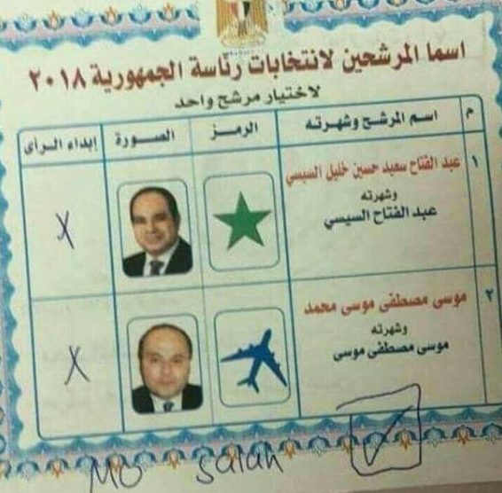 وقالت صحيفة Thesun البريطانية، السبت 31 مارس/آذار 2018، إن الناخبين المصريين قد أعطوا صلاح صوتهم، في الاقتراع الأخير -رغم أن هذا الصوت سيصبح من الأصوات الباطلة طبقاً للدستور- تعبيراً عن حبهم لصلاح، أو على الأقل عدم قبولهم للمرشحين الذين خاضوا الانتخابات، في أيام 26 حتى 28 مارس/آذار الجاري، وهما الرئيس عبدالفتاح السيسي، ومنافسه زعيم حزب غد الثورة موسى مصطفى موسى.