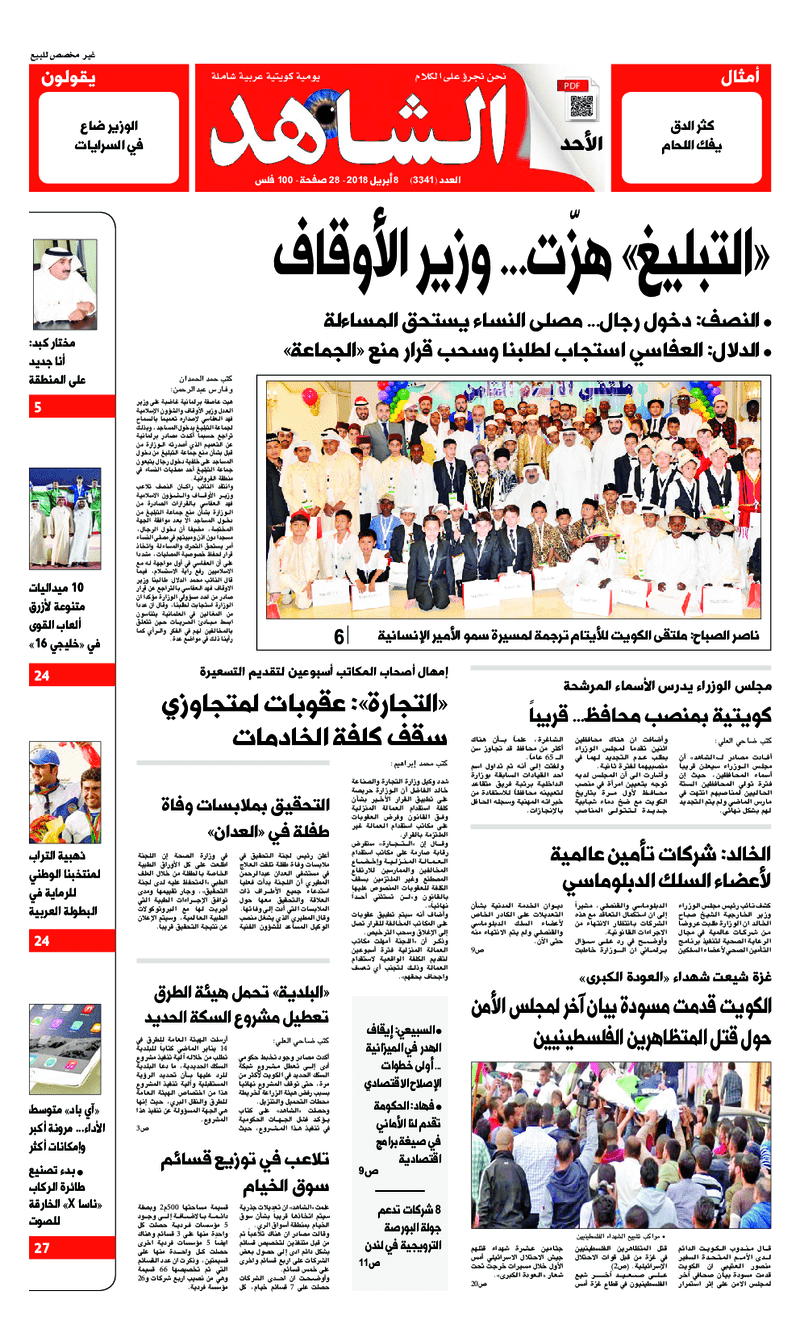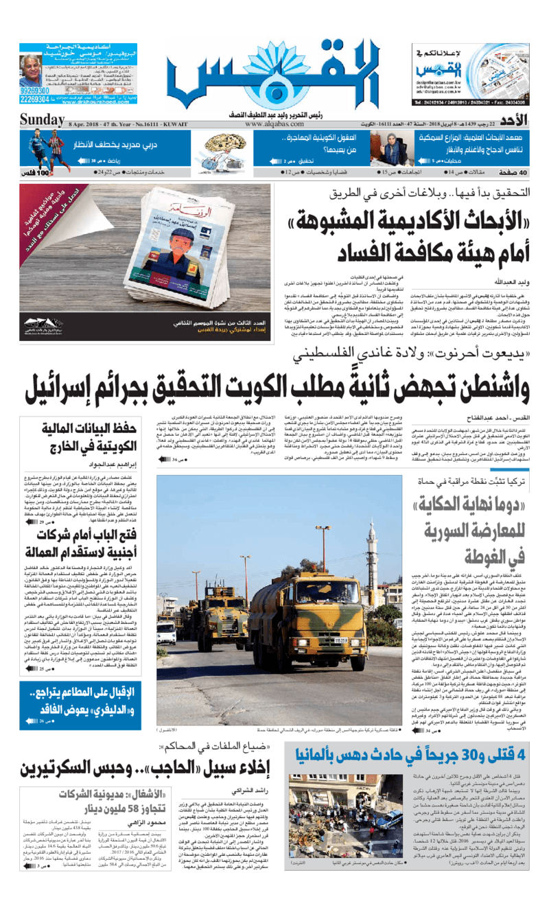 آخر الأخبار جرائم وقضايا “الجمارك” تضبط 29 ألف علبة مشروبات كحولية قادمة من دولة آسيوية في ميناء الشويخ 9 يونيو، 2024 محليات ممثلة عن دولة الكويت الطبيبة الكويتية أسماء الكندري تشارك في المؤتمر العالمي للمناظير في إيطاليا 8 يونيو، 2024 محليات “الصحة”: اكتمال وصول فريق الخدمات الطبية ببعثة الحج الكويتية لمكة المكرمة 8 يونيو، 2024 محليات “الصحة” تحدد 8 مراكز للصحة المدرسية لاستقبال الطلبة المبتعثين 8 يونيو، 2024 عربي وعالمي “الصحة العالمية”: تسجيل أول وفاة لشخص مصاب بـ«أنفلونزا الطيور» 7 يونيو، 2024 محليات عناوين الصحف الكويتية ليوم الأحد 08 أبريل 2018 محرر المحليات8 أبريل، 2018أضف تعليق1 دقائق جريدة الجريدة جريدة الأنباء جريدة القبس جريدة السياسة جريدة الوطن جريدة الراي جريدة الوسط جريدة الشاهد الوسومTop عناوين الصحف المحلية من الممكن أن يعجبك جرائم وقضايا “الجمارك” تضبط 29 ألف علبة مشروبات كحولية قادمة من دولة آسيوية في ميناء الشويخ محليات ممثلة عن دولة الكويت الطبيبة الكويتية أسماء الكندري تشارك في المؤتمر العالمي للمناظير في إيطاليا محليات “الصحة”: اكتمال وصول فريق الخدمات الطبية ببعثة الحج الكويتية لمكة المكرمة محليات “الصحة” تحدد 8 مراكز للصحة المدرسية لاستقبال الطلبة المبتعثين عربي وعالمي “الصحة العالمية”: تسجيل أول وفاة لشخص مصاب بـ«أنفلونزا الطيور» تكنولوجيا رش السحب بملح البحر.. تجربة “ثورية” لتبريد كوكب الأرض أضف تعليق أضغط هنا لإضافة تعليق إلغاء الردالتعليقالاسم البريد الإلكتروني الموقع الإلكتروني Δ هذا الموقع يستخدم خدمة أكيسميت للتقليل من البريد المزعجة. اعرف المزيد عن كيفية التعامل مع بيانات التعليقات الخاصة بك processed.