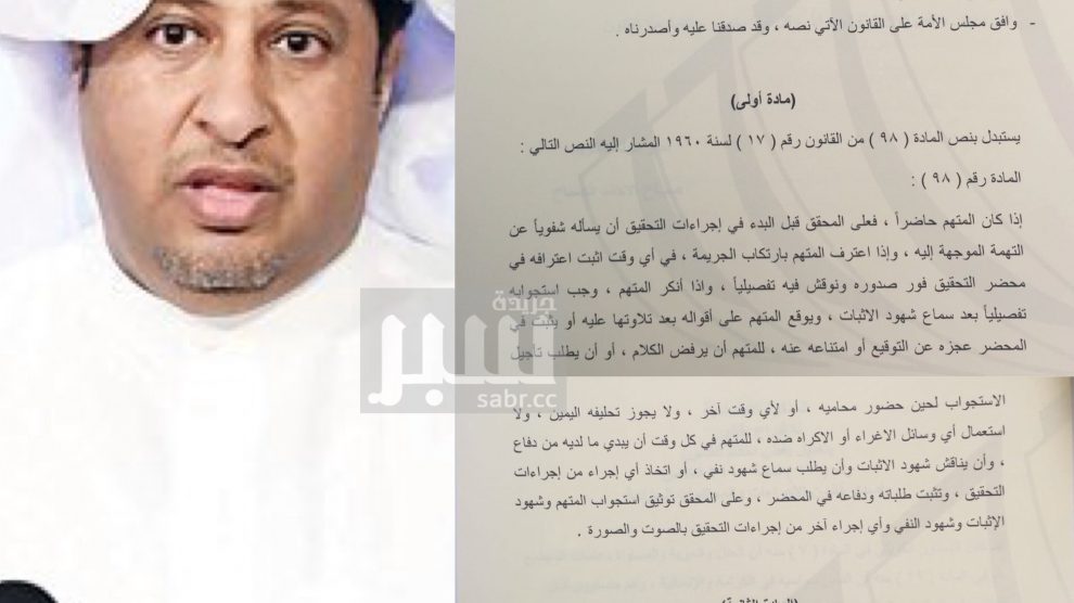 تقدم النائب الحميدي السبيعي باقتراح تعديل على قانون الاجراءات والمحاكمات الجزائية وتوثيق استجواب المتهم وشهود الإثبات وشهود النفي وأي اجراء آخر من اجراءات التحقيق بالصوت والصورة.