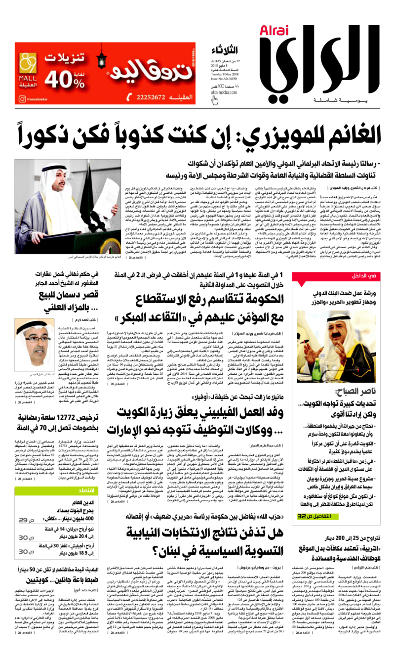 آخر الأخبار جرائم وقضايا “الجمارك” تضبط 29 ألف علبة مشروبات كحولية قادمة من دولة آسيوية في ميناء الشويخ 9 يونيو، 2024 محليات ممثلة عن دولة الكويت الطبيبة الكويتية أسماء الكندري تشارك في المؤتمر العالمي للمناظير في إيطاليا 8 يونيو، 2024 محليات “الصحة”: اكتمال وصول فريق الخدمات الطبية ببعثة الحج الكويتية لمكة المكرمة 8 يونيو، 2024 محليات “الصحة” تحدد 8 مراكز للصحة المدرسية لاستقبال الطلبة المبتعثين 8 يونيو، 2024 عربي وعالمي “الصحة العالمية”: تسجيل أول وفاة لشخص مصاب بـ«أنفلونزا الطيور» 7 يونيو، 2024 محليات عناوين الصحف الكويتية ليوم الثلاثاء 08 مايو 2018 محرر المحليات8 مايو، 2018أضف تعليق1 دقائق جريدة الجريدة جريدة الأنباء جريدة القبس جريدة السياسة جريدة الوطن جريدة الراي جريدة الوسط جريدة النهار جريدة الشاهد الوسومTop عناوين الصحف المحلية من الممكن أن يعجبك جرائم وقضايا “الجمارك” تضبط 29 ألف علبة مشروبات كحولية قادمة من دولة آسيوية في ميناء الشويخ محليات ممثلة عن دولة الكويت الطبيبة الكويتية أسماء الكندري تشارك في المؤتمر العالمي للمناظير في إيطاليا محليات “الصحة”: اكتمال وصول فريق الخدمات الطبية ببعثة الحج الكويتية لمكة المكرمة محليات “الصحة” تحدد 8 مراكز للصحة المدرسية لاستقبال الطلبة المبتعثين عربي وعالمي “الصحة العالمية”: تسجيل أول وفاة لشخص مصاب بـ«أنفلونزا الطيور» تكنولوجيا رش السحب بملح البحر.. تجربة “ثورية” لتبريد كوكب الأرض أضف تعليق أضغط هنا لإضافة تعليق إلغاء الردالتعليقالاسم البريد الإلكتروني الموقع الإلكتروني Δ هذا الموقع يستخدم خدمة أكيسميت للتقليل من البريد المزعجة. اعرف المزيد عن كيفية التعامل مع بيانات التعليقات الخاصة بك processed.