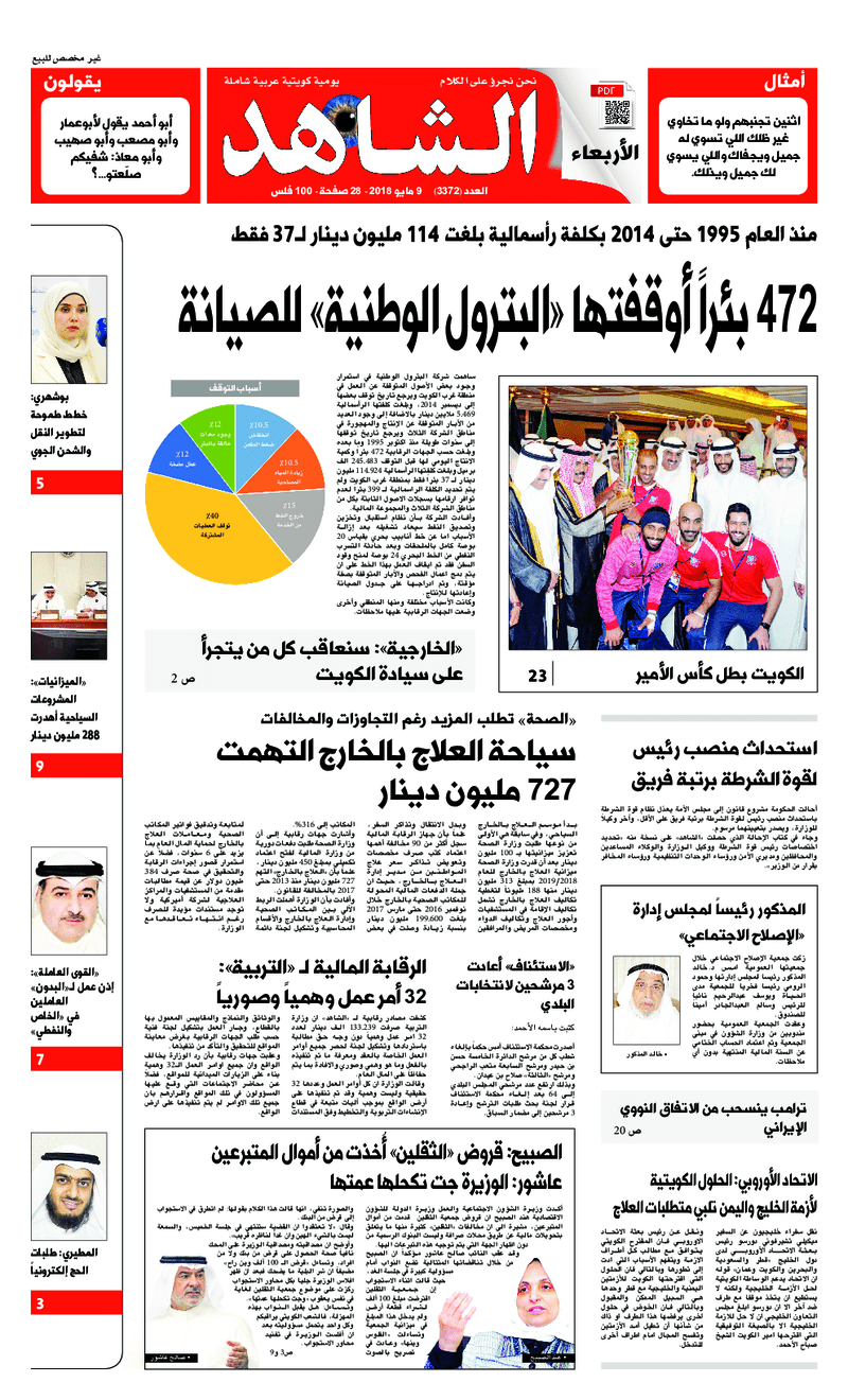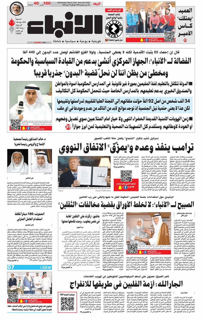 آخر الأخبار جرائم وقضايا “الجمارك” تضبط 29 ألف علبة مشروبات كحولية قادمة من دولة آسيوية في ميناء الشويخ 9 يونيو، 2024 محليات ممثلة عن دولة الكويت الطبيبة الكويتية أسماء الكندري تشارك في المؤتمر العالمي للمناظير في إيطاليا 8 يونيو، 2024 محليات “الصحة”: اكتمال وصول فريق الخدمات الطبية ببعثة الحج الكويتية لمكة المكرمة 8 يونيو، 2024 محليات “الصحة” تحدد 8 مراكز للصحة المدرسية لاستقبال الطلبة المبتعثين 8 يونيو، 2024 عربي وعالمي “الصحة العالمية”: تسجيل أول وفاة لشخص مصاب بـ«أنفلونزا الطيور» 7 يونيو، 2024 محليات عناوين الصحف الكويتية ليوم الأربعاء 09 مايو 2018 محرر المحليات9 مايو، 2018أضف تعليق1 دقائق جريدة الجريدة جريدة الأنباء جريدة القبس جريدة السياسة جريدة الوطن جريدة الراي جريدة الوسط جريدة الشاهد الوسومTop عناوين الصحف المحلية من الممكن أن يعجبك جرائم وقضايا “الجمارك” تضبط 29 ألف علبة مشروبات كحولية قادمة من دولة آسيوية في ميناء الشويخ محليات ممثلة عن دولة الكويت الطبيبة الكويتية أسماء الكندري تشارك في المؤتمر العالمي للمناظير في إيطاليا محليات “الصحة”: اكتمال وصول فريق الخدمات الطبية ببعثة الحج الكويتية لمكة المكرمة محليات “الصحة” تحدد 8 مراكز للصحة المدرسية لاستقبال الطلبة المبتعثين عربي وعالمي “الصحة العالمية”: تسجيل أول وفاة لشخص مصاب بـ«أنفلونزا الطيور» تكنولوجيا رش السحب بملح البحر.. تجربة “ثورية” لتبريد كوكب الأرض أضف تعليق أضغط هنا لإضافة تعليق إلغاء الردالتعليقالاسم البريد الإلكتروني الموقع الإلكتروني Δ هذا الموقع يستخدم خدمة أكيسميت للتقليل من البريد المزعجة. اعرف المزيد عن كيفية التعامل مع بيانات التعليقات الخاصة بك processed.