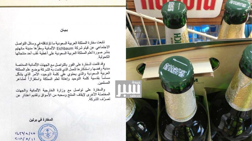 وقالت السفارة السعودية، في بيان، إنها “تابعت ما تم تناقله في وسائل التواصل الاجتماعي عن قيام شركة Eichbaum الألمانية ومقرها مدينة مانهايم بنشر صورة علم المملكة على أغطية أحد منتجاتها الكحولية”.
