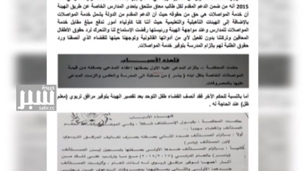 وقال ناصر الحربي أن القضاء أنصفه بإصدار حكميْن من محكمة الاستئناف يلزمان الهيئة بتوفير مرافق تربوي لابنه (ياسر) وكذلك بتوفير خدمة المواصلات.