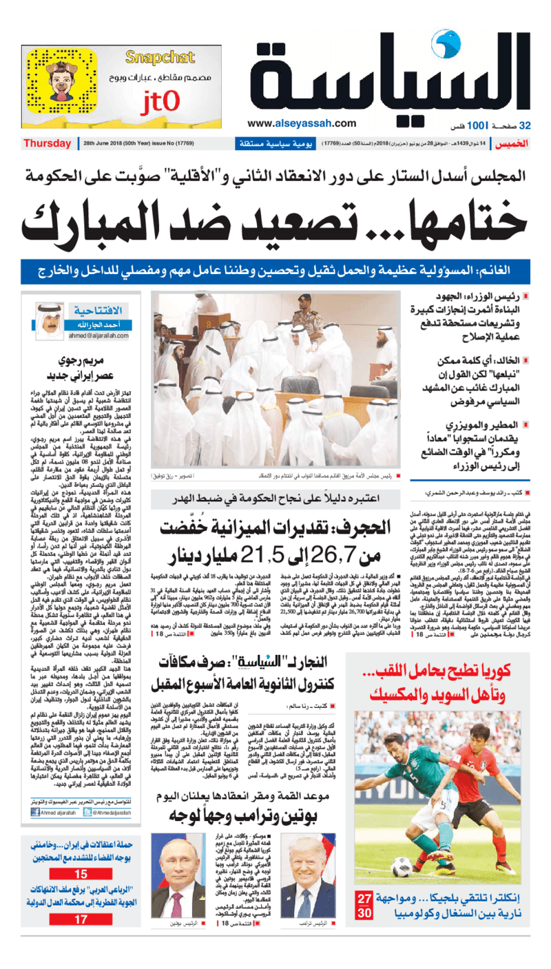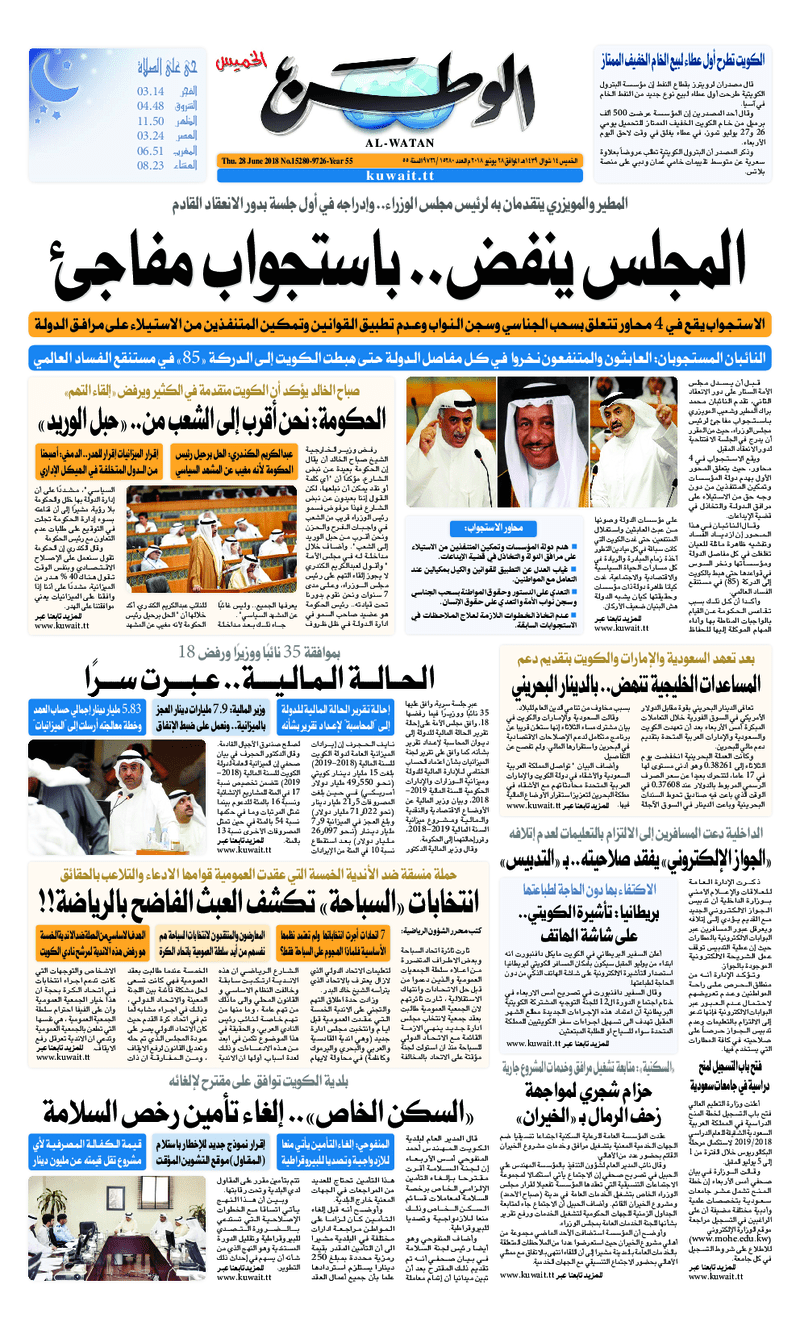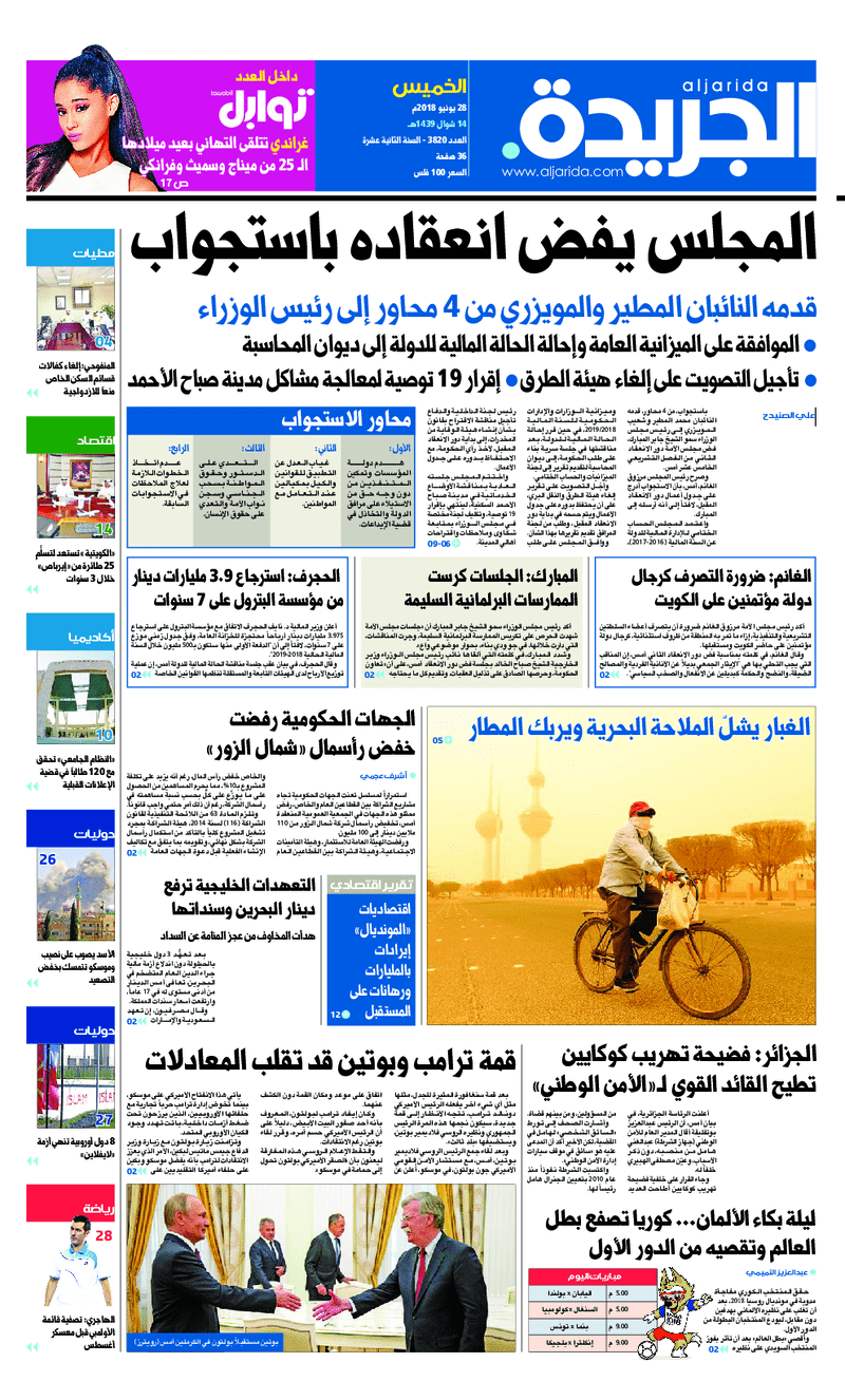 آخر الأخبار جرائم وقضايا “الجمارك” تضبط 29 ألف علبة مشروبات كحولية قادمة من دولة آسيوية في ميناء الشويخ 9 يونيو، 2024 محليات ممثلة عن دولة الكويت الطبيبة الكويتية أسماء الكندري تشارك في المؤتمر العالمي للمناظير في إيطاليا 8 يونيو، 2024 محليات “الصحة”: اكتمال وصول فريق الخدمات الطبية ببعثة الحج الكويتية لمكة المكرمة 8 يونيو، 2024 محليات “الصحة” تحدد 8 مراكز للصحة المدرسية لاستقبال الطلبة المبتعثين 8 يونيو، 2024 عربي وعالمي “الصحة العالمية”: تسجيل أول وفاة لشخص مصاب بـ«أنفلونزا الطيور» 7 يونيو، 2024 محليات عناوين الصحف الكويتية ليوم الخميس 28 يونيو 2018 محرر المحليات28 يونيو، 2018أضف تعليق1 دقائق جريدة الجريدة جريدة الأنباء جريدة القبس جريدة السياسة جريدة الوطن جريدة الراي جريدة الوسط جريدة النهار جريدة الشاهد الوسومTop عناوين الصحف المحلية من الممكن أن يعجبك جرائم وقضايا “الجمارك” تضبط 29 ألف علبة مشروبات كحولية قادمة من دولة آسيوية في ميناء الشويخ محليات ممثلة عن دولة الكويت الطبيبة الكويتية أسماء الكندري تشارك في المؤتمر العالمي للمناظير في إيطاليا محليات “الصحة”: اكتمال وصول فريق الخدمات الطبية ببعثة الحج الكويتية لمكة المكرمة محليات “الصحة” تحدد 8 مراكز للصحة المدرسية لاستقبال الطلبة المبتعثين عربي وعالمي “الصحة العالمية”: تسجيل أول وفاة لشخص مصاب بـ«أنفلونزا الطيور» تكنولوجيا رش السحب بملح البحر.. تجربة “ثورية” لتبريد كوكب الأرض أضف تعليق أضغط هنا لإضافة تعليق إلغاء الردالتعليقالاسم البريد الإلكتروني الموقع الإلكتروني Δ هذا الموقع يستخدم خدمة أكيسميت للتقليل من البريد المزعجة. اعرف المزيد عن كيفية التعامل مع بيانات التعليقات الخاصة بك processed.