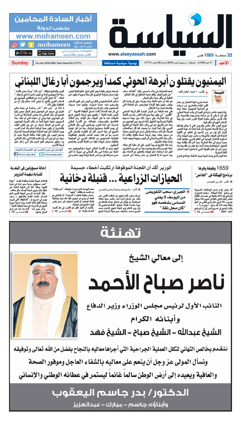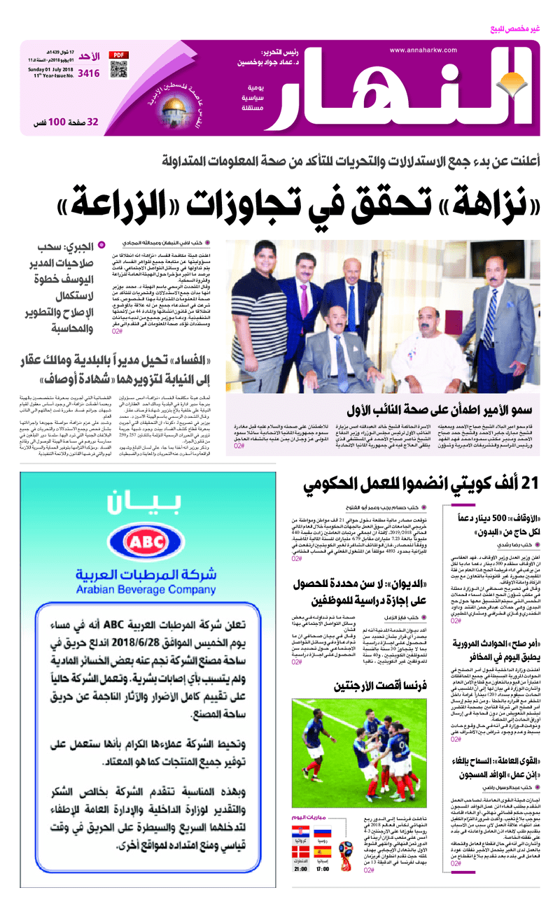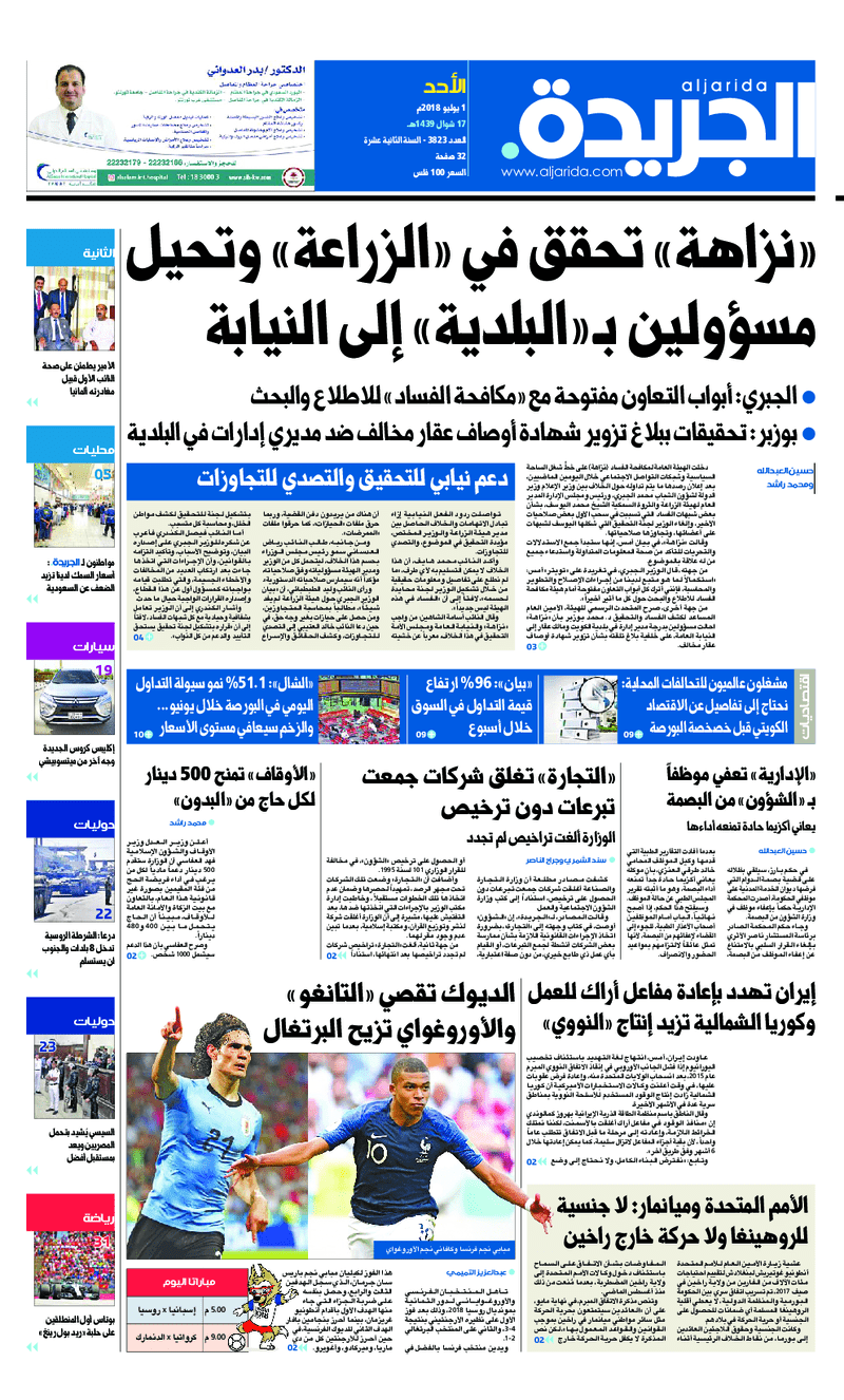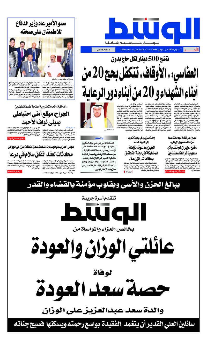 آخر الأخبار جرائم وقضايا “الجمارك” تضبط 29 ألف علبة مشروبات كحولية قادمة من دولة آسيوية في ميناء الشويخ 9 يونيو، 2024 محليات ممثلة عن دولة الكويت الطبيبة الكويتية أسماء الكندري تشارك في المؤتمر العالمي للمناظير في إيطاليا 8 يونيو، 2024 محليات “الصحة”: اكتمال وصول فريق الخدمات الطبية ببعثة الحج الكويتية لمكة المكرمة 8 يونيو، 2024 محليات “الصحة” تحدد 8 مراكز للصحة المدرسية لاستقبال الطلبة المبتعثين 8 يونيو، 2024 عربي وعالمي “الصحة العالمية”: تسجيل أول وفاة لشخص مصاب بـ«أنفلونزا الطيور» 7 يونيو، 2024 محليات عناوين الصحف الكويتية ليوم الأحد 01 يوليو 2018 محرر المحليات1 يوليو، 2018أضف تعليق1 دقائق جريدة الجريدة جريدة الأنباء جريدة القبس جريدة السياسة جريدة الوطن جريدة الوسط جريدة النهار الوسومTop عناوين الصحف المحلية من الممكن أن يعجبك جرائم وقضايا “الجمارك” تضبط 29 ألف علبة مشروبات كحولية قادمة من دولة آسيوية في ميناء الشويخ محليات ممثلة عن دولة الكويت الطبيبة الكويتية أسماء الكندري تشارك في المؤتمر العالمي للمناظير في إيطاليا محليات “الصحة”: اكتمال وصول فريق الخدمات الطبية ببعثة الحج الكويتية لمكة المكرمة محليات “الصحة” تحدد 8 مراكز للصحة المدرسية لاستقبال الطلبة المبتعثين عربي وعالمي “الصحة العالمية”: تسجيل أول وفاة لشخص مصاب بـ«أنفلونزا الطيور» تكنولوجيا رش السحب بملح البحر.. تجربة “ثورية” لتبريد كوكب الأرض أضف تعليق أضغط هنا لإضافة تعليق إلغاء الردالتعليقالاسم البريد الإلكتروني الموقع الإلكتروني Δ هذا الموقع يستخدم خدمة أكيسميت للتقليل من البريد المزعجة. اعرف المزيد عن كيفية التعامل مع بيانات التعليقات الخاصة بك processed.