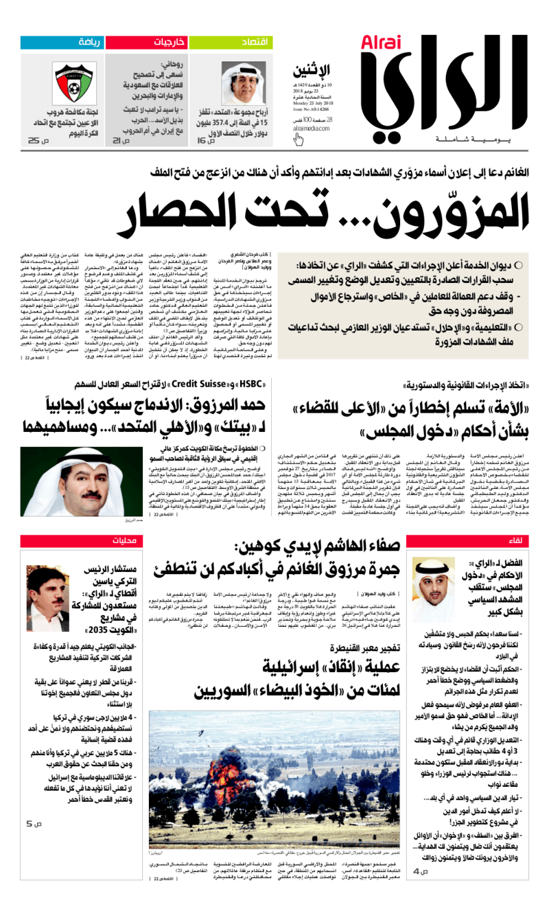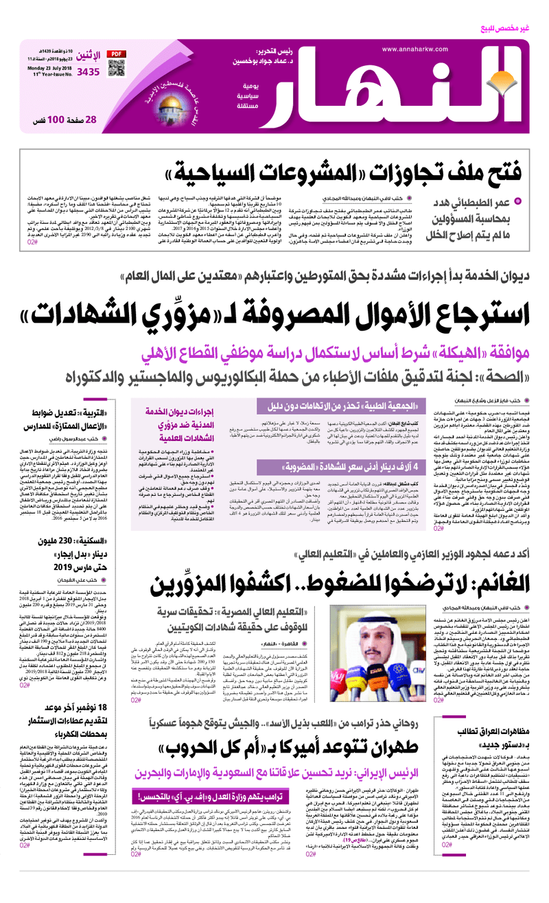 آخر الأخبار جرائم وقضايا “الجمارك” تضبط 29 ألف علبة مشروبات كحولية قادمة من دولة آسيوية في ميناء الشويخ 9 يونيو، 2024 محليات ممثلة عن دولة الكويت الطبيبة الكويتية أسماء الكندري تشارك في المؤتمر العالمي للمناظير في إيطاليا 8 يونيو، 2024 محليات “الصحة”: اكتمال وصول فريق الخدمات الطبية ببعثة الحج الكويتية لمكة المكرمة 8 يونيو، 2024 محليات “الصحة” تحدد 8 مراكز للصحة المدرسية لاستقبال الطلبة المبتعثين 8 يونيو، 2024 عربي وعالمي “الصحة العالمية”: تسجيل أول وفاة لشخص مصاب بـ«أنفلونزا الطيور» 7 يونيو، 2024 محليات عناوين الصحف الكويتية ليوم الاثنين 23 يوليو 2018 محرر المحليات23 يوليو، 2018أضف تعليق1 دقائق جريدة الجريدة جريدة الأنباء جريدة القبس جريدة السياسة جريدة الوطن جريدة الراي جريدة الوسط جريدة النهار الوسومTop عناوين الصحف المحلية من الممكن أن يعجبك جرائم وقضايا “الجمارك” تضبط 29 ألف علبة مشروبات كحولية قادمة من دولة آسيوية في ميناء الشويخ محليات ممثلة عن دولة الكويت الطبيبة الكويتية أسماء الكندري تشارك في المؤتمر العالمي للمناظير في إيطاليا محليات “الصحة”: اكتمال وصول فريق الخدمات الطبية ببعثة الحج الكويتية لمكة المكرمة محليات “الصحة” تحدد 8 مراكز للصحة المدرسية لاستقبال الطلبة المبتعثين عربي وعالمي “الصحة العالمية”: تسجيل أول وفاة لشخص مصاب بـ«أنفلونزا الطيور» تكنولوجيا رش السحب بملح البحر.. تجربة “ثورية” لتبريد كوكب الأرض أضف تعليق أضغط هنا لإضافة تعليق إلغاء الردالتعليقالاسم البريد الإلكتروني الموقع الإلكتروني Δ هذا الموقع يستخدم خدمة أكيسميت للتقليل من البريد المزعجة. اعرف المزيد عن كيفية التعامل مع بيانات التعليقات الخاصة بك processed.