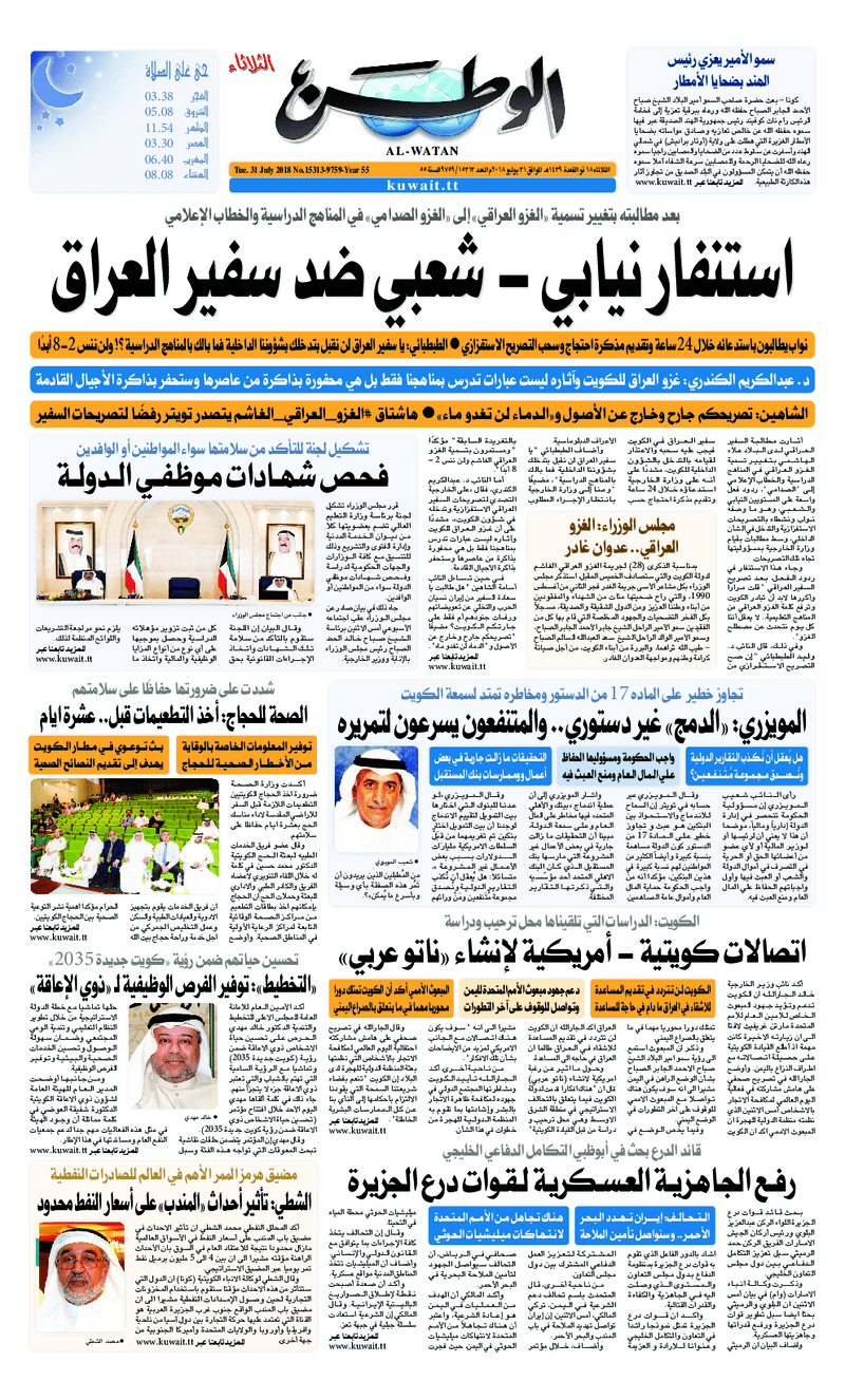 آخر الأخبار جرائم وقضايا “الجمارك” تضبط 29 ألف علبة مشروبات كحولية قادمة من دولة آسيوية في ميناء الشويخ 9 يونيو، 2024 محليات ممثلة عن دولة الكويت الطبيبة الكويتية أسماء الكندري تشارك في المؤتمر العالمي للمناظير في إيطاليا 8 يونيو، 2024 محليات “الصحة”: اكتمال وصول فريق الخدمات الطبية ببعثة الحج الكويتية لمكة المكرمة 8 يونيو، 2024 محليات “الصحة” تحدد 8 مراكز للصحة المدرسية لاستقبال الطلبة المبتعثين 8 يونيو، 2024 عربي وعالمي “الصحة العالمية”: تسجيل أول وفاة لشخص مصاب بـ«أنفلونزا الطيور» 7 يونيو، 2024 محليات عناوين الصحف الكويتية ليوم الثلاثاء 31 يوليو 2018 محرر المحليات31 يوليو، 2018أضف تعليق1 دقائق جريدة الجريدة جريدة الأنباء جريدة القبس جريدة السياسة جريدة الوطن جريدة الراي جريدة الوسط جريدة النهار الوسومTop عناوين الصحف المحلية من الممكن أن يعجبك جرائم وقضايا “الجمارك” تضبط 29 ألف علبة مشروبات كحولية قادمة من دولة آسيوية في ميناء الشويخ محليات ممثلة عن دولة الكويت الطبيبة الكويتية أسماء الكندري تشارك في المؤتمر العالمي للمناظير في إيطاليا محليات “الصحة”: اكتمال وصول فريق الخدمات الطبية ببعثة الحج الكويتية لمكة المكرمة محليات “الصحة” تحدد 8 مراكز للصحة المدرسية لاستقبال الطلبة المبتعثين عربي وعالمي “الصحة العالمية”: تسجيل أول وفاة لشخص مصاب بـ«أنفلونزا الطيور» تكنولوجيا رش السحب بملح البحر.. تجربة “ثورية” لتبريد كوكب الأرض أضف تعليق أضغط هنا لإضافة تعليق إلغاء الردالتعليقالاسم البريد الإلكتروني الموقع الإلكتروني Δ هذا الموقع يستخدم خدمة أكيسميت للتقليل من البريد المزعجة. اعرف المزيد عن كيفية التعامل مع بيانات التعليقات الخاصة بك processed.