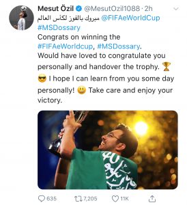 وجه الألماني مسعود أوزيل، نجم آرسنال الإنجليزي، تهنئة إلى مساعد الدوسري، البطل السعودي المتوج بلقب كأس العالم التفاعلية FIFA eWORLD CUP.