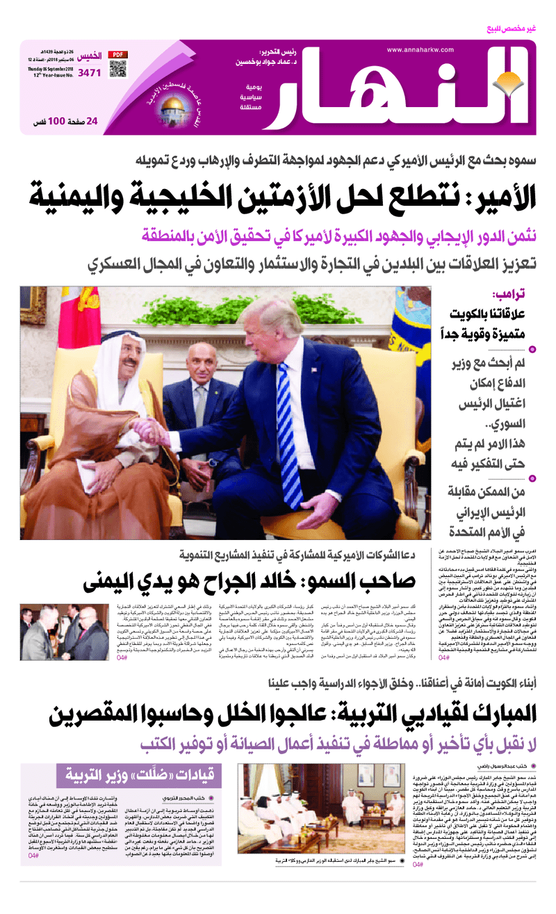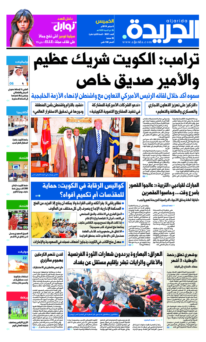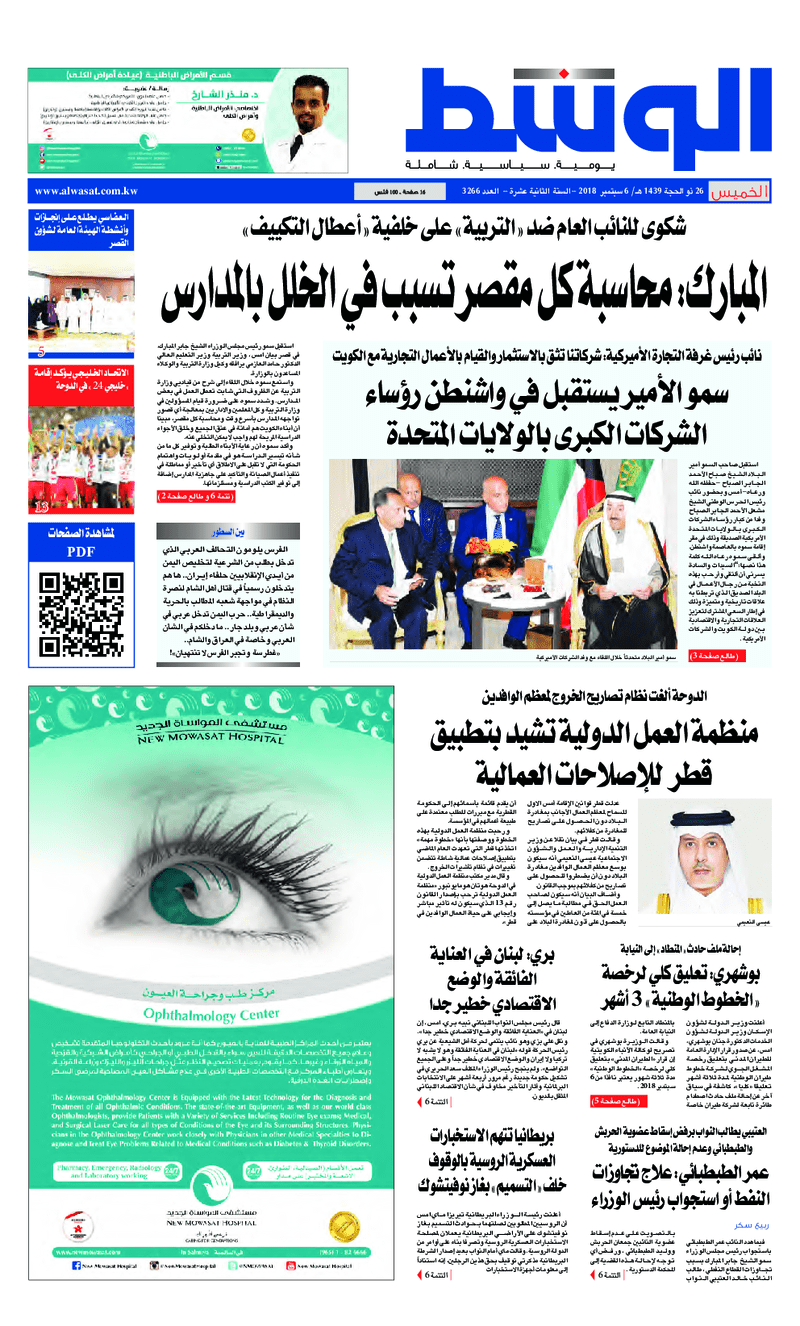 آخر الأخبار جرائم وقضايا “الجمارك” تضبط 29 ألف علبة مشروبات كحولية قادمة من دولة آسيوية في ميناء الشويخ 9 يونيو، 2024 محليات ممثلة عن دولة الكويت الطبيبة الكويتية أسماء الكندري تشارك في المؤتمر العالمي للمناظير في إيطاليا 8 يونيو، 2024 محليات “الصحة”: اكتمال وصول فريق الخدمات الطبية ببعثة الحج الكويتية لمكة المكرمة 8 يونيو، 2024 محليات “الصحة” تحدد 8 مراكز للصحة المدرسية لاستقبال الطلبة المبتعثين 8 يونيو، 2024 عربي وعالمي “الصحة العالمية”: تسجيل أول وفاة لشخص مصاب بـ«أنفلونزا الطيور» 7 يونيو، 2024 محليات عناوين الصحف الكويتية ليوم الخميس 06 سبتمبر 2018 محرر المحليات6 سبتمبر، 2018أضف تعليق1 دقائق جريدة الجريدة جريدة الأنباء جريدة القبس جريدة السياسة جريدة الوطن جريدة الراي جريدة الوسط جريدة النهار الوسومTop عناوين الصحف المحلية من الممكن أن يعجبك جرائم وقضايا “الجمارك” تضبط 29 ألف علبة مشروبات كحولية قادمة من دولة آسيوية في ميناء الشويخ محليات ممثلة عن دولة الكويت الطبيبة الكويتية أسماء الكندري تشارك في المؤتمر العالمي للمناظير في إيطاليا محليات “الصحة”: اكتمال وصول فريق الخدمات الطبية ببعثة الحج الكويتية لمكة المكرمة محليات “الصحة” تحدد 8 مراكز للصحة المدرسية لاستقبال الطلبة المبتعثين عربي وعالمي “الصحة العالمية”: تسجيل أول وفاة لشخص مصاب بـ«أنفلونزا الطيور» تكنولوجيا رش السحب بملح البحر.. تجربة “ثورية” لتبريد كوكب الأرض أضف تعليق أضغط هنا لإضافة تعليق إلغاء الردالتعليقالاسم البريد الإلكتروني الموقع الإلكتروني Δ هذا الموقع يستخدم خدمة أكيسميت للتقليل من البريد المزعجة. اعرف المزيد عن كيفية التعامل مع بيانات التعليقات الخاصة بك processed.