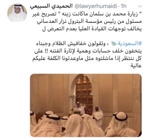 وقال السبيعي عبر “تويتر”: تصريح غير مسئول من رئيس مؤسسة البترول نزار العدساني يخالف توجهات القيادة العليا بعدم التعرض ل #السعودية، وتقولون خفافيش الظلام وجبناء يتخفون خلف حسابات وهمية لإثارة الفتنة! على كل ننتظر إذا ماشلتوه مثل ماوعدتونا الكلفة عليكم عالية.