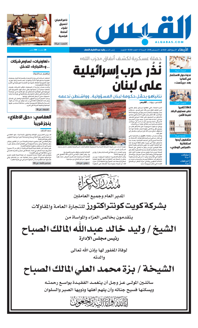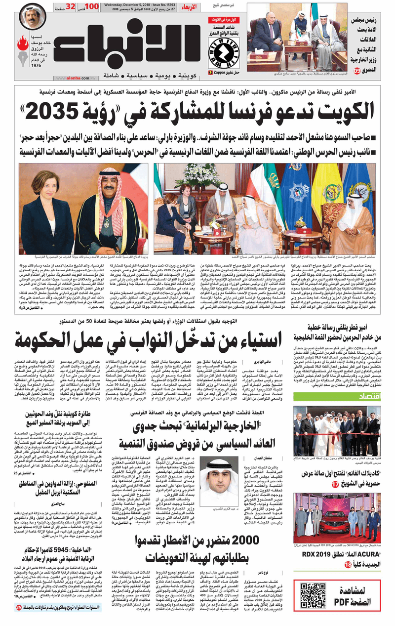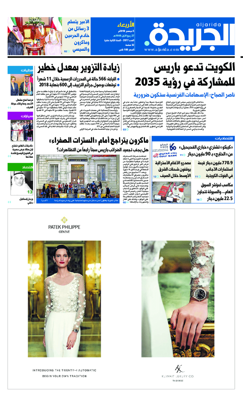 آخر الأخبار جرائم وقضايا “الجمارك” تضبط 29 ألف علبة مشروبات كحولية قادمة من دولة آسيوية في ميناء الشويخ 9 يونيو، 2024 محليات ممثلة عن دولة الكويت الطبيبة الكويتية أسماء الكندري تشارك في المؤتمر العالمي للمناظير في إيطاليا 8 يونيو، 2024 محليات “الصحة”: اكتمال وصول فريق الخدمات الطبية ببعثة الحج الكويتية لمكة المكرمة 8 يونيو، 2024 محليات “الصحة” تحدد 8 مراكز للصحة المدرسية لاستقبال الطلبة المبتعثين 8 يونيو، 2024 عربي وعالمي “الصحة العالمية”: تسجيل أول وفاة لشخص مصاب بـ«أنفلونزا الطيور» 7 يونيو، 2024 محليات عناوين الصحف الكويتية ليوم الأربعاء 05 ديسمبر 2018 محرر المحليات5 ديسمبر، 2018أضف تعليق1 دقائق جريدة الجريدة جريدة الأنباء جريدة القبس جريدة السياسة جريدة الوطن جريدة الوسط جريدة النهار الوسومTop عناوين الصحف المحلية من الممكن أن يعجبك جرائم وقضايا “الجمارك” تضبط 29 ألف علبة مشروبات كحولية قادمة من دولة آسيوية في ميناء الشويخ محليات ممثلة عن دولة الكويت الطبيبة الكويتية أسماء الكندري تشارك في المؤتمر العالمي للمناظير في إيطاليا محليات “الصحة”: اكتمال وصول فريق الخدمات الطبية ببعثة الحج الكويتية لمكة المكرمة محليات “الصحة” تحدد 8 مراكز للصحة المدرسية لاستقبال الطلبة المبتعثين عربي وعالمي “الصحة العالمية”: تسجيل أول وفاة لشخص مصاب بـ«أنفلونزا الطيور» تكنولوجيا رش السحب بملح البحر.. تجربة “ثورية” لتبريد كوكب الأرض أضف تعليق أضغط هنا لإضافة تعليق إلغاء الردالتعليقالاسم البريد الإلكتروني الموقع الإلكتروني Δ هذا الموقع يستخدم خدمة أكيسميت للتقليل من البريد المزعجة. اعرف المزيد عن كيفية التعامل مع بيانات التعليقات الخاصة بك processed.