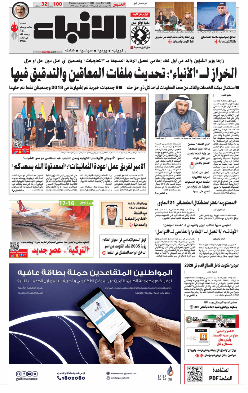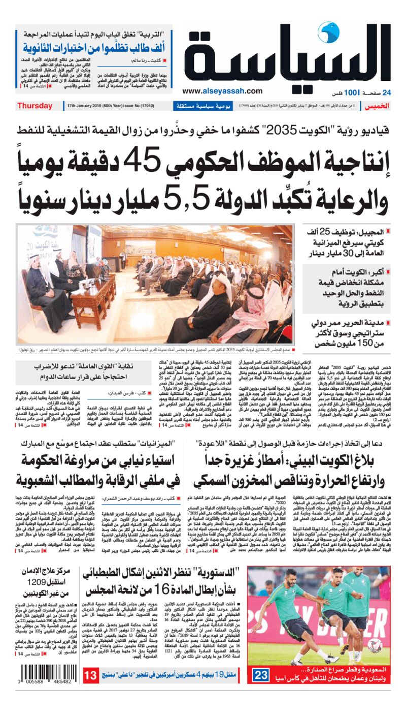 آخر الأخبار جرائم وقضايا “الجمارك” تضبط 29 ألف علبة مشروبات كحولية قادمة من دولة آسيوية في ميناء الشويخ 9 يونيو، 2024 محليات ممثلة عن دولة الكويت الطبيبة الكويتية أسماء الكندري تشارك في المؤتمر العالمي للمناظير في إيطاليا 8 يونيو، 2024 محليات “الصحة”: اكتمال وصول فريق الخدمات الطبية ببعثة الحج الكويتية لمكة المكرمة 8 يونيو، 2024 محليات “الصحة” تحدد 8 مراكز للصحة المدرسية لاستقبال الطلبة المبتعثين 8 يونيو، 2024 عربي وعالمي “الصحة العالمية”: تسجيل أول وفاة لشخص مصاب بـ«أنفلونزا الطيور» 7 يونيو، 2024 محليات عناوين الصحف الكويتية ليوم الخميس 17 يناير 2019 محرر المحليات17 يناير، 2019أضف تعليق1 دقائق جريدة الجريدة جريدة الأنباء جريدة القبس جريدة السياسة جريدة الراي جريدة الوسط جريدة النهار الوسومTop عناوين الصحف المحلية من الممكن أن يعجبك جرائم وقضايا “الجمارك” تضبط 29 ألف علبة مشروبات كحولية قادمة من دولة آسيوية في ميناء الشويخ محليات ممثلة عن دولة الكويت الطبيبة الكويتية أسماء الكندري تشارك في المؤتمر العالمي للمناظير في إيطاليا محليات “الصحة”: اكتمال وصول فريق الخدمات الطبية ببعثة الحج الكويتية لمكة المكرمة محليات “الصحة” تحدد 8 مراكز للصحة المدرسية لاستقبال الطلبة المبتعثين عربي وعالمي “الصحة العالمية”: تسجيل أول وفاة لشخص مصاب بـ«أنفلونزا الطيور» تكنولوجيا رش السحب بملح البحر.. تجربة “ثورية” لتبريد كوكب الأرض أضف تعليق أضغط هنا لإضافة تعليق إلغاء الردالتعليقالاسم البريد الإلكتروني الموقع الإلكتروني Δ هذا الموقع يستخدم خدمة أكيسميت للتقليل من البريد المزعجة. اعرف المزيد عن كيفية التعامل مع بيانات التعليقات الخاصة بك processed.