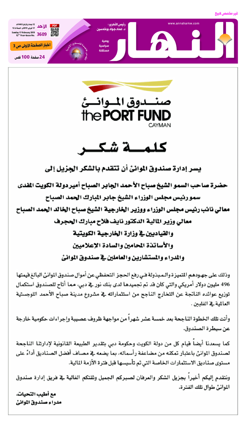 وزير المالية : اقترحنا تخصيص 10 بالمئة من أرباح الصندوق العربي الانمائي لدعم فلسطين 22 مايو، 2024أضف تعليق
