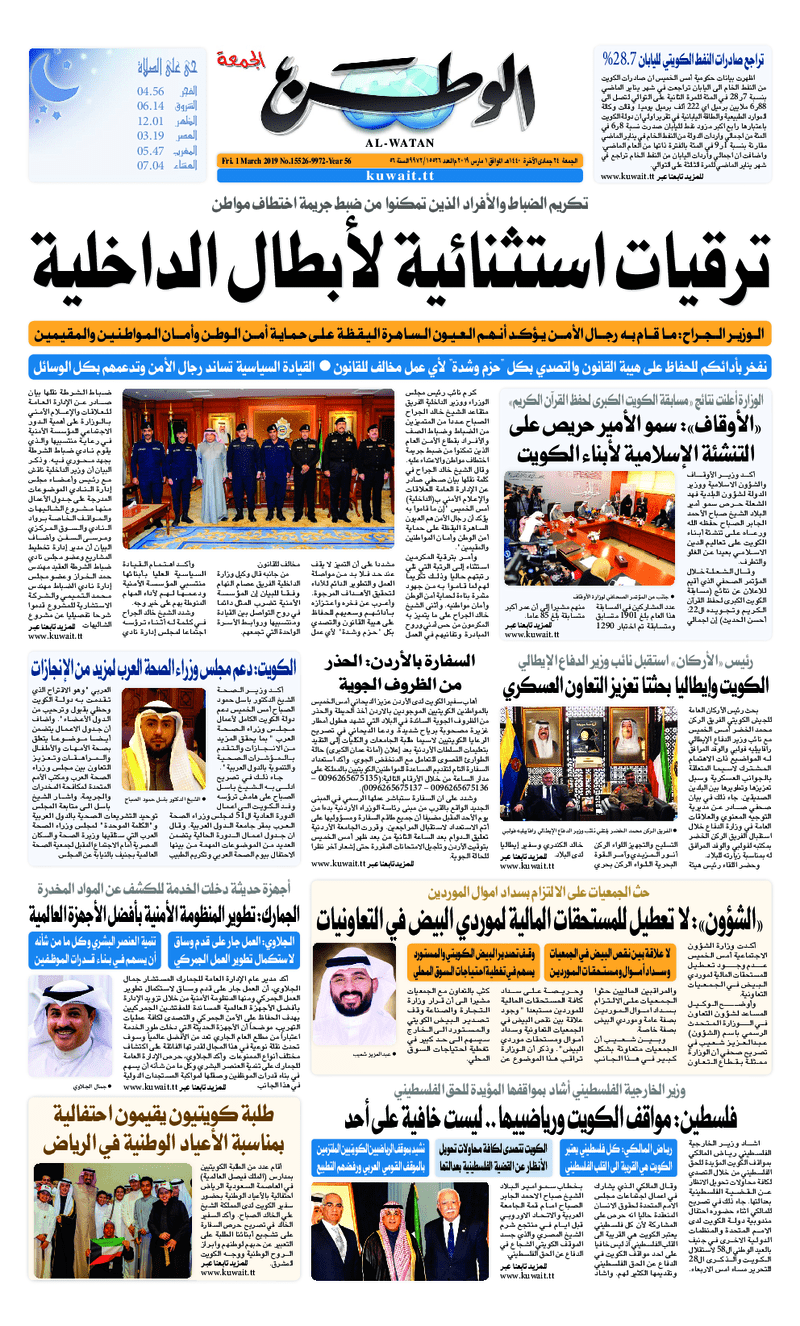 آخر الأخبار جرائم وقضايا “الجمارك” تضبط 29 ألف علبة مشروبات كحولية قادمة من دولة آسيوية في ميناء الشويخ 9 يونيو، 2024 محليات ممثلة عن دولة الكويت الطبيبة الكويتية أسماء الكندري تشارك في المؤتمر العالمي للمناظير في إيطاليا 8 يونيو، 2024 محليات “الصحة”: اكتمال وصول فريق الخدمات الطبية ببعثة الحج الكويتية لمكة المكرمة 8 يونيو، 2024 محليات “الصحة” تحدد 8 مراكز للصحة المدرسية لاستقبال الطلبة المبتعثين 8 يونيو، 2024 عربي وعالمي “الصحة العالمية”: تسجيل أول وفاة لشخص مصاب بـ«أنفلونزا الطيور» 7 يونيو، 2024 محليات عناوين الصحف الكويتية ليوم الجمعة 01 مارس 2019 محرر المحليات1 مارس، 2019أضف تعليق1 دقائق جريدة الجريدة جريدة الأنباء جريدة القبس جريدة السياسة جريدة الوطن الوسومTop عناوين الصحف المحلية من الممكن أن يعجبك جرائم وقضايا “الجمارك” تضبط 29 ألف علبة مشروبات كحولية قادمة من دولة آسيوية في ميناء الشويخ محليات ممثلة عن دولة الكويت الطبيبة الكويتية أسماء الكندري تشارك في المؤتمر العالمي للمناظير في إيطاليا محليات “الصحة”: اكتمال وصول فريق الخدمات الطبية ببعثة الحج الكويتية لمكة المكرمة محليات “الصحة” تحدد 8 مراكز للصحة المدرسية لاستقبال الطلبة المبتعثين عربي وعالمي “الصحة العالمية”: تسجيل أول وفاة لشخص مصاب بـ«أنفلونزا الطيور» تكنولوجيا رش السحب بملح البحر.. تجربة “ثورية” لتبريد كوكب الأرض أضف تعليق أضغط هنا لإضافة تعليق إلغاء الردالتعليقالاسم البريد الإلكتروني الموقع الإلكتروني Δ هذا الموقع يستخدم خدمة أكيسميت للتقليل من البريد المزعجة. اعرف المزيد عن كيفية التعامل مع بيانات التعليقات الخاصة بك processed.
