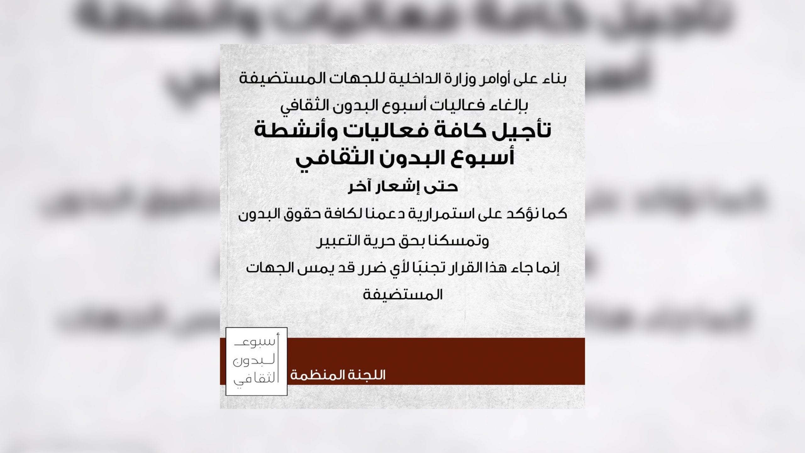 أعلنت اللجنة المنطمة لـ”أسبوع البدون الثقافي” أنه بناء على أوامر وزارة الداخلية للجهات المستضيفة بإلغاء فعاليات أسبوع البدون الثقافي تم تأجيل فعاليات وأنشطة الأسبوع الى إشعار آخر.
