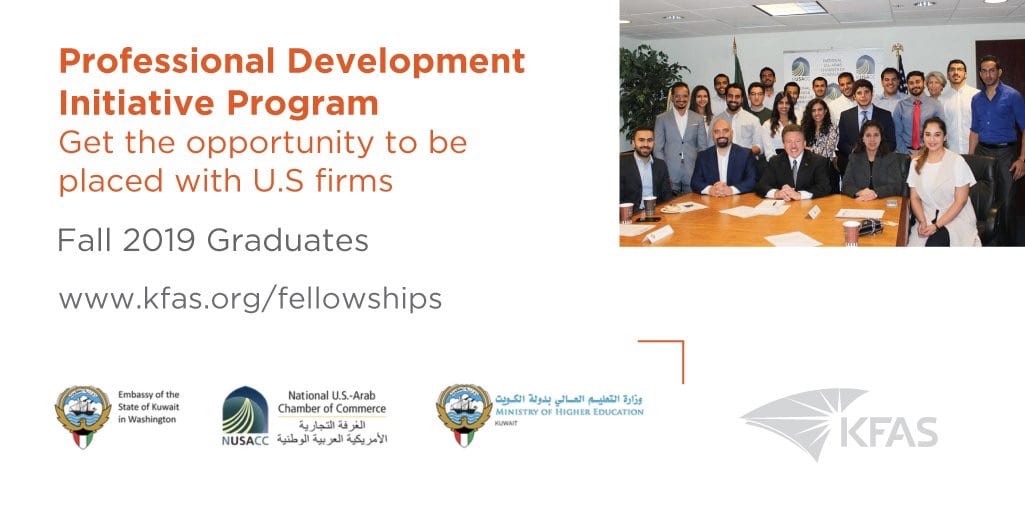 تقدم مؤسسة الكويت للتقدم العلمي فرصة ذهبية لطلبة الكويت في امريكا المتوقع تخرجهم قريبا. حيث تقدم المؤسسة فرصة لهم للعمل في إحدى الشركات و المؤسسات في امريكا لمدة عام بما يتناسب مع تخصصهم و مهارتهم.