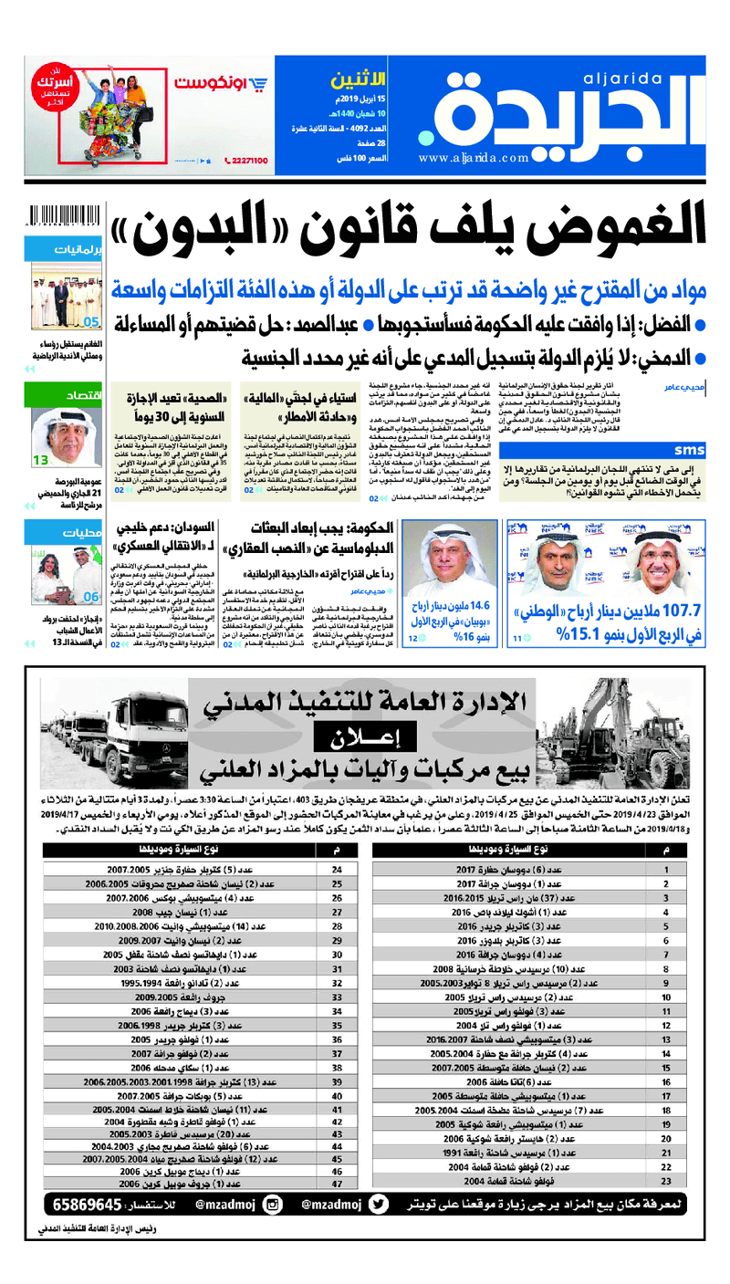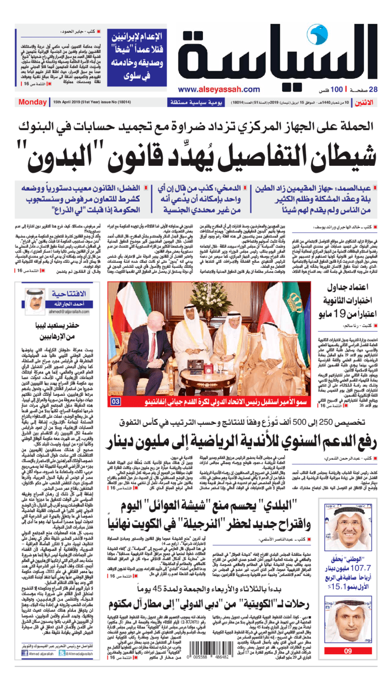 آخر الأخبار جرائم وقضايا “الجمارك” تضبط 29 ألف علبة مشروبات كحولية قادمة من دولة آسيوية في ميناء الشويخ 9 يونيو، 2024 محليات ممثلة عن دولة الكويت الطبيبة الكويتية أسماء الكندري تشارك في المؤتمر العالمي للمناظير في إيطاليا 8 يونيو، 2024 محليات “الصحة”: اكتمال وصول فريق الخدمات الطبية ببعثة الحج الكويتية لمكة المكرمة 8 يونيو، 2024 محليات “الصحة” تحدد 8 مراكز للصحة المدرسية لاستقبال الطلبة المبتعثين 8 يونيو، 2024 عربي وعالمي “الصحة العالمية”: تسجيل أول وفاة لشخص مصاب بـ«أنفلونزا الطيور» 7 يونيو، 2024 محليات عناوين الصحف الكويتية ليوم الاثنين 15 أبريل 2019 محرر المحليات15 أبريل، 2019أضف تعليق1 دقائق جريدة الجريدة جريدة الأنباء جريدة القبس جريدة السياسة جريدة الوسط جريدة النهار الوسومTop عناوين الصحف المحلية من الممكن أن يعجبك جرائم وقضايا “الجمارك” تضبط 29 ألف علبة مشروبات كحولية قادمة من دولة آسيوية في ميناء الشويخ محليات ممثلة عن دولة الكويت الطبيبة الكويتية أسماء الكندري تشارك في المؤتمر العالمي للمناظير في إيطاليا محليات “الصحة”: اكتمال وصول فريق الخدمات الطبية ببعثة الحج الكويتية لمكة المكرمة محليات “الصحة” تحدد 8 مراكز للصحة المدرسية لاستقبال الطلبة المبتعثين عربي وعالمي “الصحة العالمية”: تسجيل أول وفاة لشخص مصاب بـ«أنفلونزا الطيور» تكنولوجيا رش السحب بملح البحر.. تجربة “ثورية” لتبريد كوكب الأرض أضف تعليق أضغط هنا لإضافة تعليق إلغاء الردالتعليقالاسم البريد الإلكتروني الموقع الإلكتروني Δ هذا الموقع يستخدم خدمة أكيسميت للتقليل من البريد المزعجة. اعرف المزيد عن كيفية التعامل مع بيانات التعليقات الخاصة بك processed.