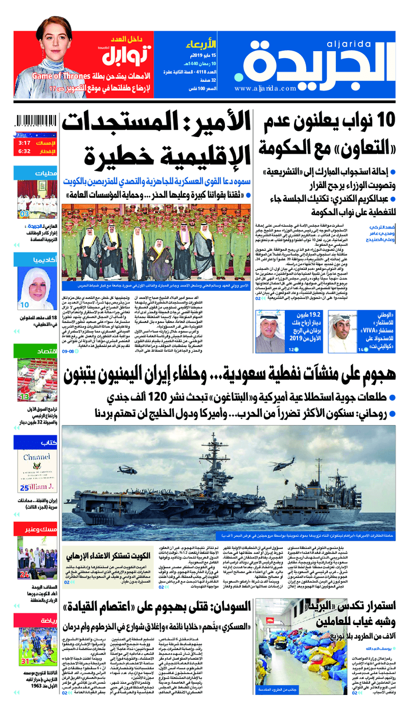 آخر الأخبار جرائم وقضايا “الجمارك” تضبط 29 ألف علبة مشروبات كحولية قادمة من دولة آسيوية في ميناء الشويخ 9 يونيو، 2024 محليات ممثلة عن دولة الكويت الطبيبة الكويتية أسماء الكندري تشارك في المؤتمر العالمي للمناظير في إيطاليا 8 يونيو، 2024 محليات “الصحة”: اكتمال وصول فريق الخدمات الطبية ببعثة الحج الكويتية لمكة المكرمة 8 يونيو، 2024 محليات “الصحة” تحدد 8 مراكز للصحة المدرسية لاستقبال الطلبة المبتعثين 8 يونيو، 2024 عربي وعالمي “الصحة العالمية”: تسجيل أول وفاة لشخص مصاب بـ«أنفلونزا الطيور» 7 يونيو، 2024 محليات عناوين الصحف الكويتية ليوم الأربعاء 15 مايو 2019 محرر المحليات15 مايو، 2019أضف تعليق1 دقائق جريدة الجريدة جريدة الأنباء جريدة القبس جريدة السياسة جريدة الوطن جريدة الراي جريدة الوسط جريدة النهار الوسومTop عناوين الصحف المحلية من الممكن أن يعجبك جرائم وقضايا “الجمارك” تضبط 29 ألف علبة مشروبات كحولية قادمة من دولة آسيوية في ميناء الشويخ محليات ممثلة عن دولة الكويت الطبيبة الكويتية أسماء الكندري تشارك في المؤتمر العالمي للمناظير في إيطاليا محليات “الصحة”: اكتمال وصول فريق الخدمات الطبية ببعثة الحج الكويتية لمكة المكرمة محليات “الصحة” تحدد 8 مراكز للصحة المدرسية لاستقبال الطلبة المبتعثين عربي وعالمي “الصحة العالمية”: تسجيل أول وفاة لشخص مصاب بـ«أنفلونزا الطيور» تكنولوجيا رش السحب بملح البحر.. تجربة “ثورية” لتبريد كوكب الأرض أضف تعليق أضغط هنا لإضافة تعليق إلغاء الردالتعليقالاسم البريد الإلكتروني الموقع الإلكتروني Δ هذا الموقع يستخدم خدمة أكيسميت للتقليل من البريد المزعجة. اعرف المزيد عن كيفية التعامل مع بيانات التعليقات الخاصة بك processed.